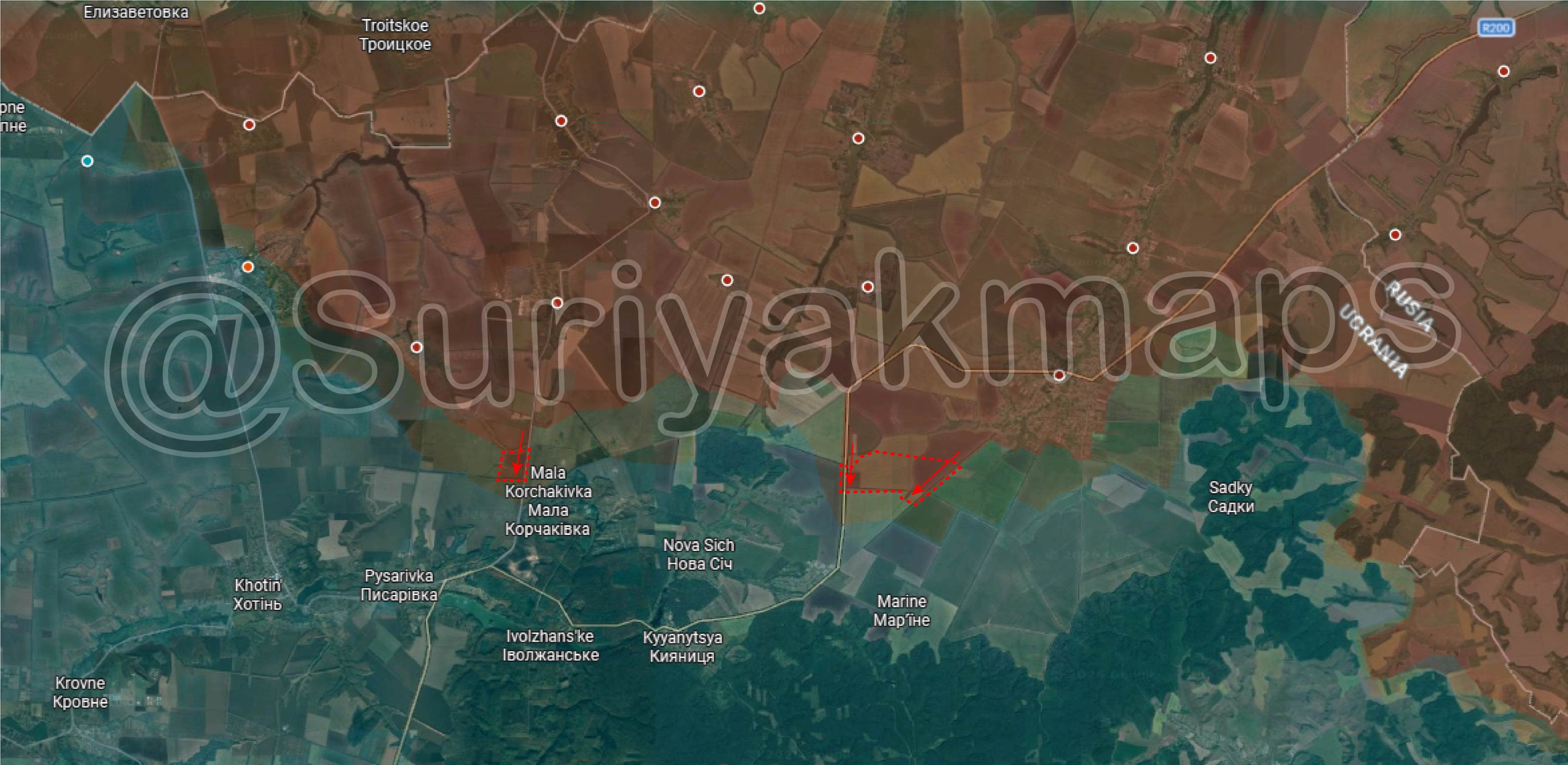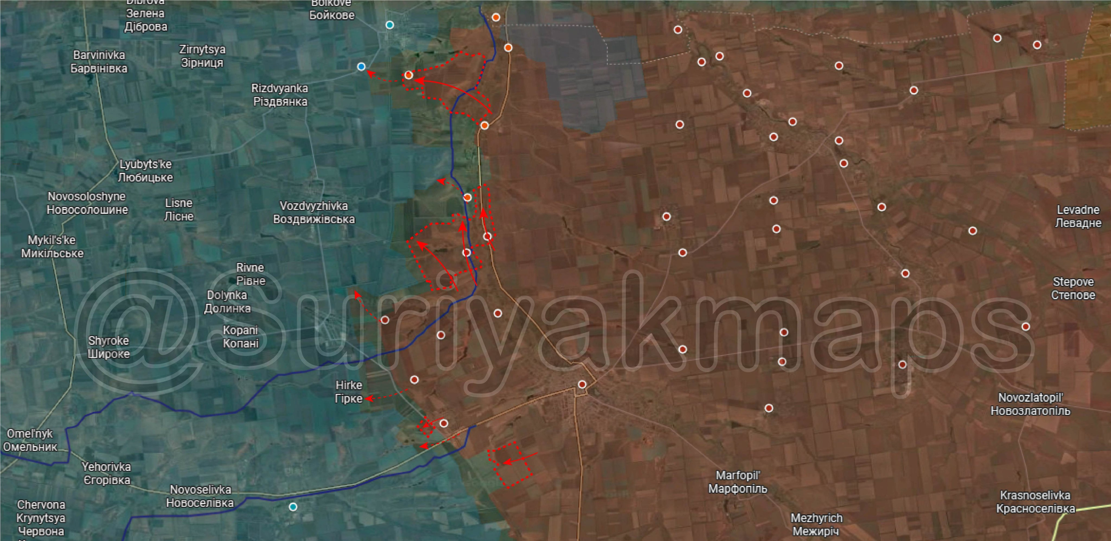 Tình hình trên mặt trận Huliaipole: Trong tuần trước, Nga đã chiếm được một trong những ngọn đồi quan trọng nhất ở phía tây nam Huliapole, cho phép lực lượng này kiểm soát hầu như tất cả các vị trí ở phía đông tuyến đường sắt. Chính dọc theo tuyến này, các lực lượng Nga tiếp tục tăng cường hoạt động, tiếp cận vùng ngoại ô Hirke và Verkhnya Tersa. Ngoài ra, sau khi chiếm lại một loạt vị trí trên tuyến phòng thủ chính của Ukraina và xa hơn về phía bắc, binh lính Nga một lần nữa đã bảo vệ được các địa phương Olenokostiantynivka và Varvarivka, cho phép giao tranh quay trở lại Pryluky. Tình huống tương tự cũng xảy ra ở Kosivtseve, nơi quân đội Nga chiếm lại phần lớn địa phương và tiếp tục các hoạt động hướng tới làng Prydorozhnje.