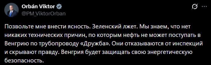"Hãy để tôi nói rõ. Ông Zelenskyy đang nói dối. Chúng ta biết rằng không có lý do kỹ thuật nào khiến dầu không thể chảy đến Hungary qua đường ống Druzhba. Họ đang từ chối kiểm tra và che giấu sự thật. Hungary sẽ bảo vệ an ninh năng lượng của mình."