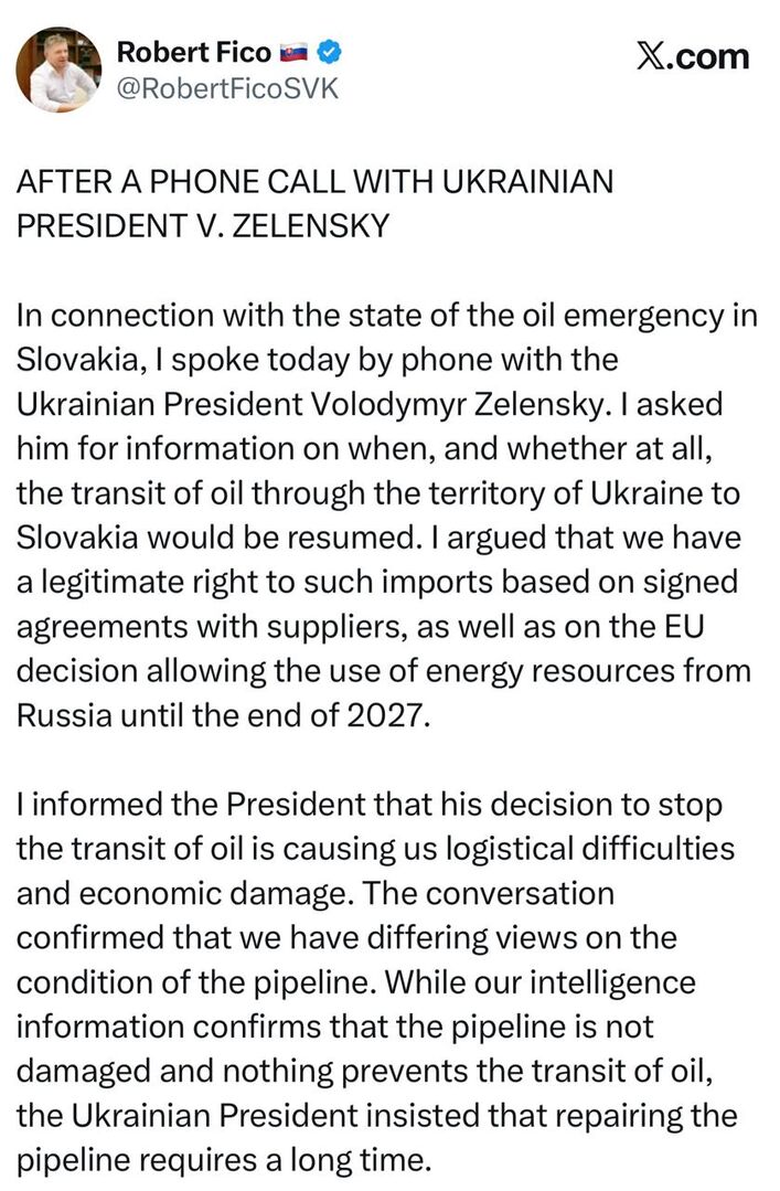 Tôi đã thông báo với ông Zelenskyy rằng quyết định tạm dừng vận chuyển dầu đang gây khó khăn về hậu cần cho chúng tôi và gây thiệt hại kinh tế. Cuộc trò chuyện của chúng tôi đã xác nhận những quan điểm khác nhau về tình trạng của đường ống. Trong khi thông tin tình báo của chúng tôi xác nhận rằng đường ống vẫn còn nguyên vẹn và không có gì cản trở việc vận chuyển dầu, Tổng thống Ukraine vẫn khăng khăng rằng việc sửa chữa sẽ mất rất nhiều thời gian.