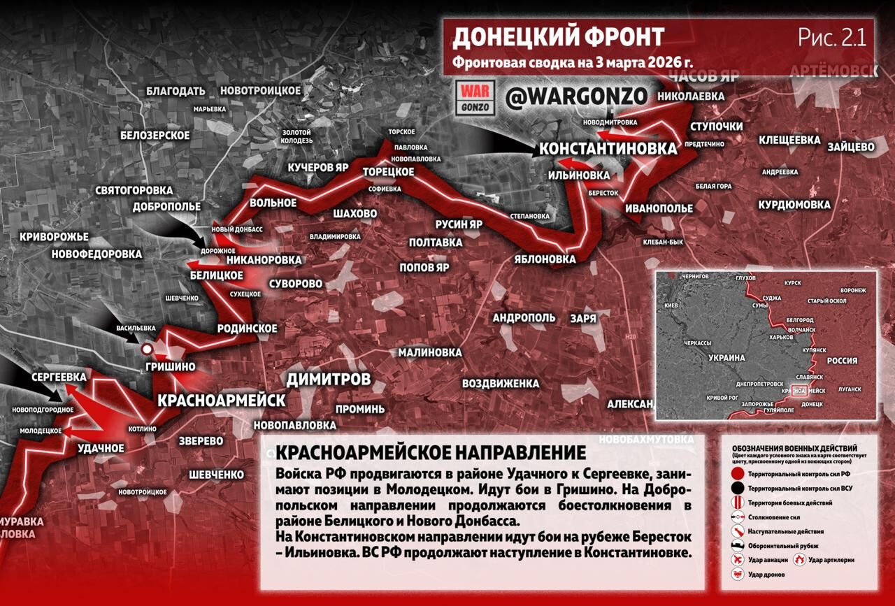 Theo hướng Krasnoarmeysky, quân đội Nga đang tiến gần Udachnoye về phía Sergeyevka và chiếm giữ các vị trí ở Molodetske. Giao tranh đang diễn ra ở Grishino. Theo hướng Dobropolsky, các cuộc đụng độ tiếp tục diễn ra gần Belitskoye và Novyi Donbas. (Hình 2.1)