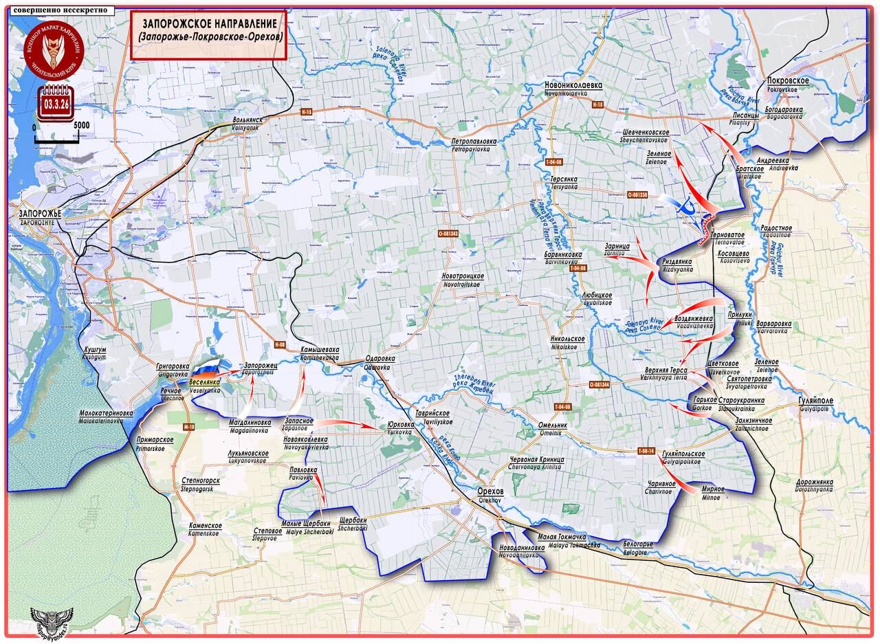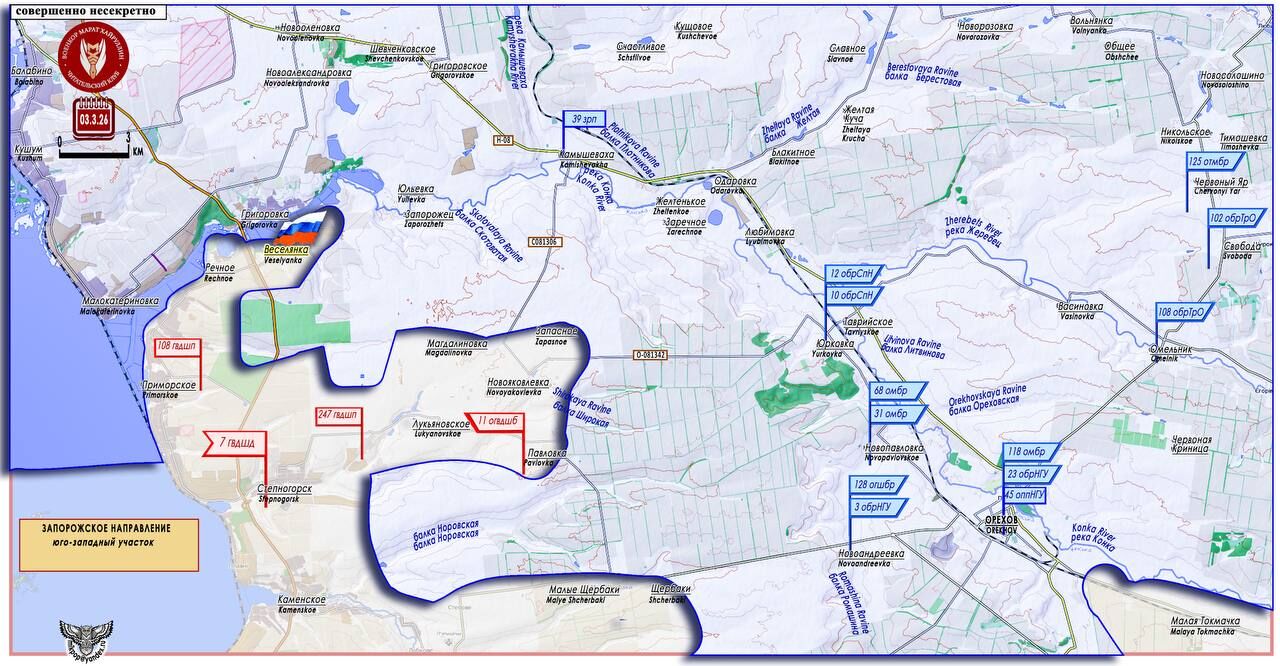 Hôm qua, làng Veselyanka (47°40′58″ N 35°22′28″ E - dân số 944 người năm 2001) đã được giải phóng. Làng Zaporozhets nằm cách đó 4,5 km về phía thượng nguồn, và làng Grigorovka nằm ở bờ đối diện. Lực lượng vũ trang Nga kiểm soát các tuyến đường C081306 và O-081342, kéo dài theo hướng xuyên tâm từ làng Novoyakovlevka đến sông Konka và đường cao tốc H-08.