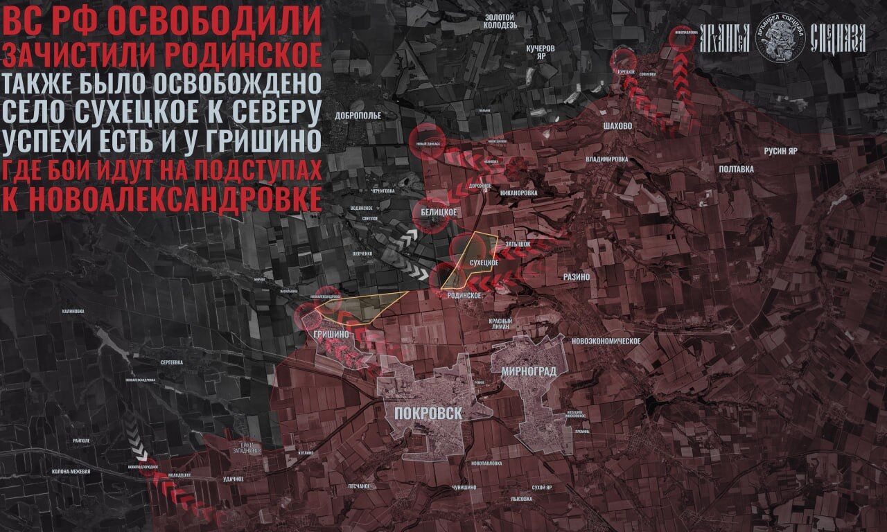 Quân đội Nga đang dần đẩy lùi địch khỏi vùng ngoại ô của cụm đô thị Pokrovsk-Mirnograd. Máy bay tấn công đang kiểm soát các khu dân cư ở khu vực Grishino-Volne, nhằm thiết lập vị trí thuận lợi cho cuộc tấn công Dobropillya trong tương lai.