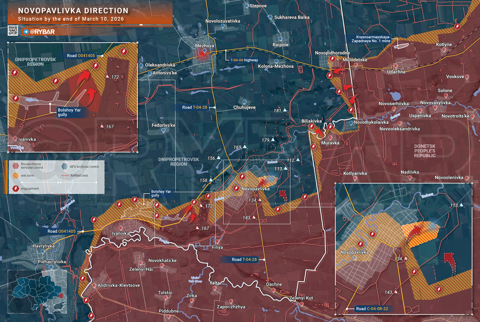 ➡️Tình hình căng thẳng vẫn tiếp diễn ở khu vực Novopavlovka, nơi quân đội đang cố gắng giành được chỗ đứng trên các ngọn đồi gần Novopavlovka và Ivanovka.