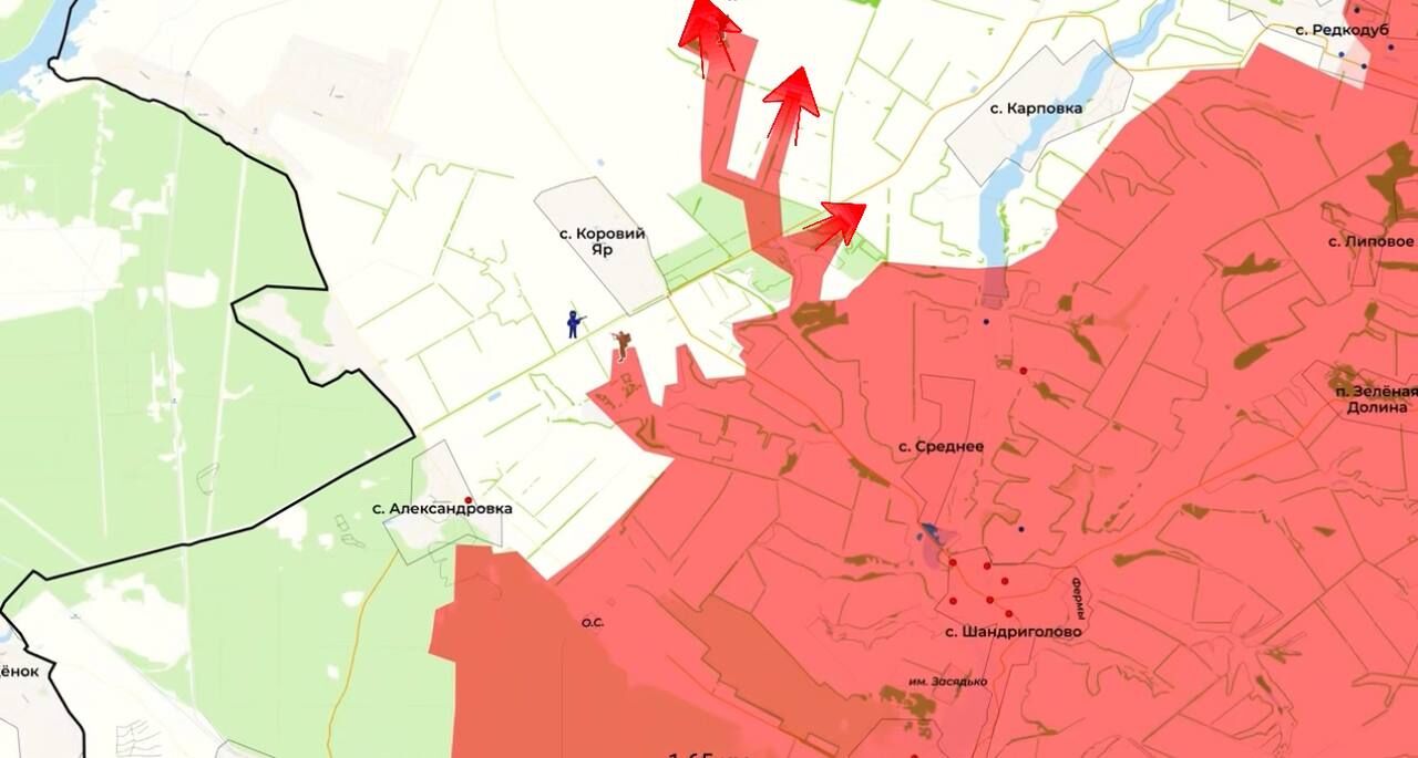 Phía bắc Karpovka, quân đội Nga tiếp tục tiến công về Vovchiy Yar và đã cắt đứt tuyến đường hậu cần chính của Lực lượng Vũ trang Ukraine từ Karpovka đến Koroviy Yar, dẫn đến việc giải phóng Redkodub.
