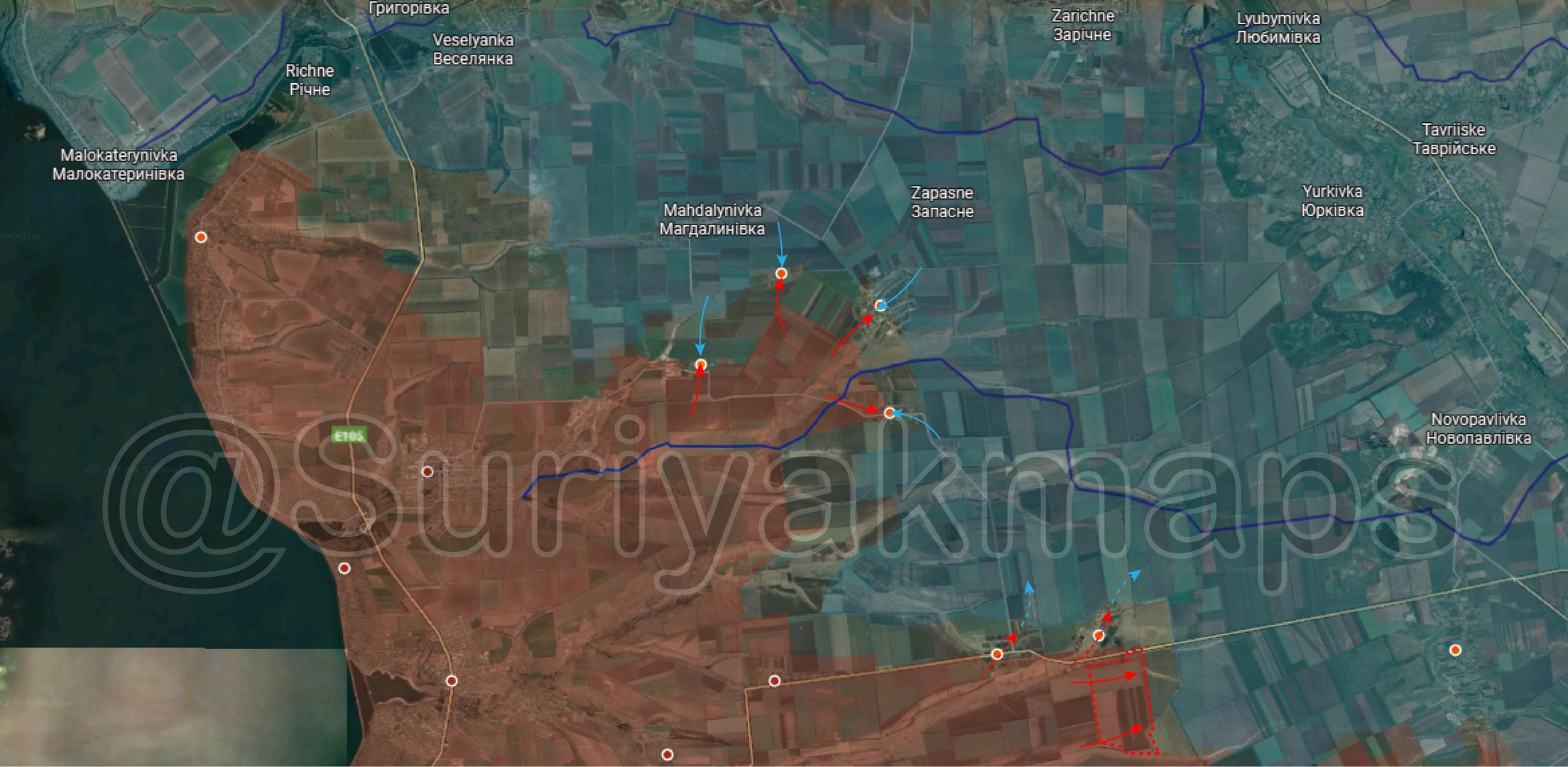 Tại tỉnh Saparoschija, những hình ảnh đầu tiên cho thấy quân Nga giành được lãnh thổ ở trung tâm Prymorske. 🏙📸 Tuy nhiên, một ngôi làng khác ở phía đông Oirkihiv cũng được cho là đã bị quân Nga chiếm giữ. 🏘➡️