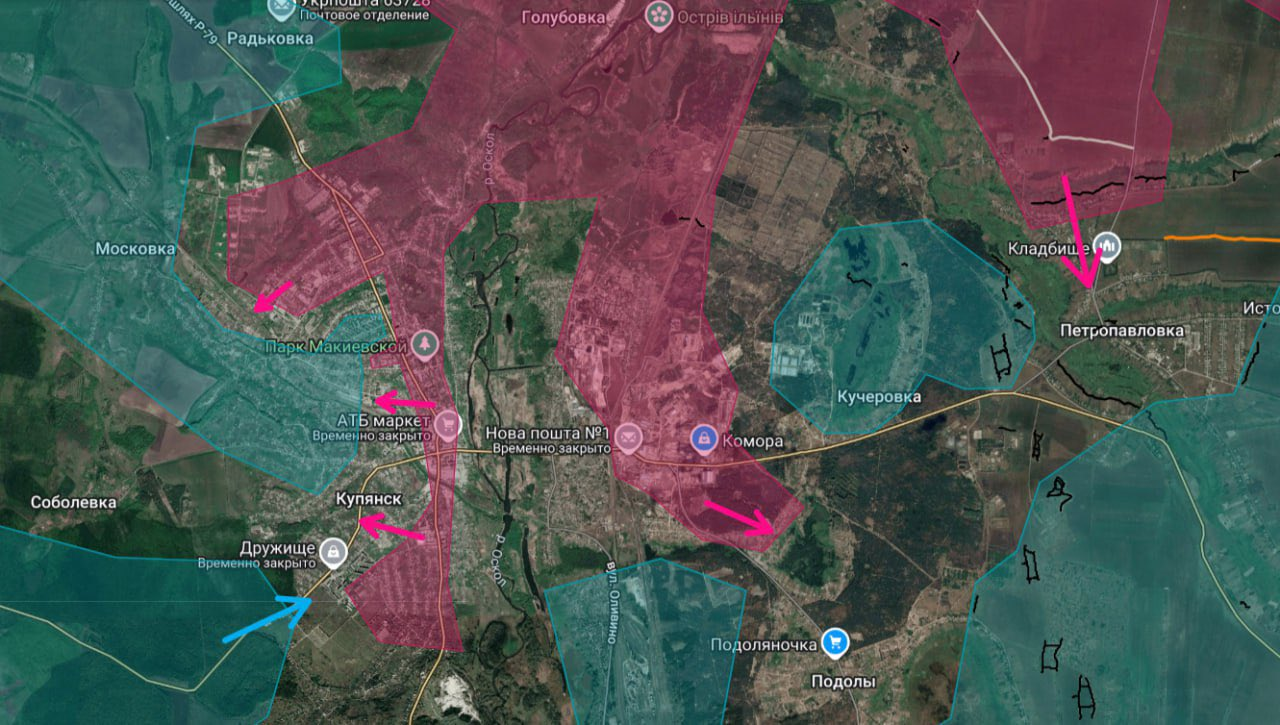 1. Kupyansk: Các đơn vị tấn công của Sư đoàn 68 đã giành lại quyền kiểm soát trung tâm thành phố, bao gồm cả Tòa nhà Quốc hội và Bưu điện. Áp lực cũng đang được gia tăng đối với Petropavlovka và Podoly. Lực lượng Nga đang dần tiến công. Quân đội Kiev đang tấn công từ hướng Sobolevka, cố gắng chiếm giữ phần phía nam của thành phố.