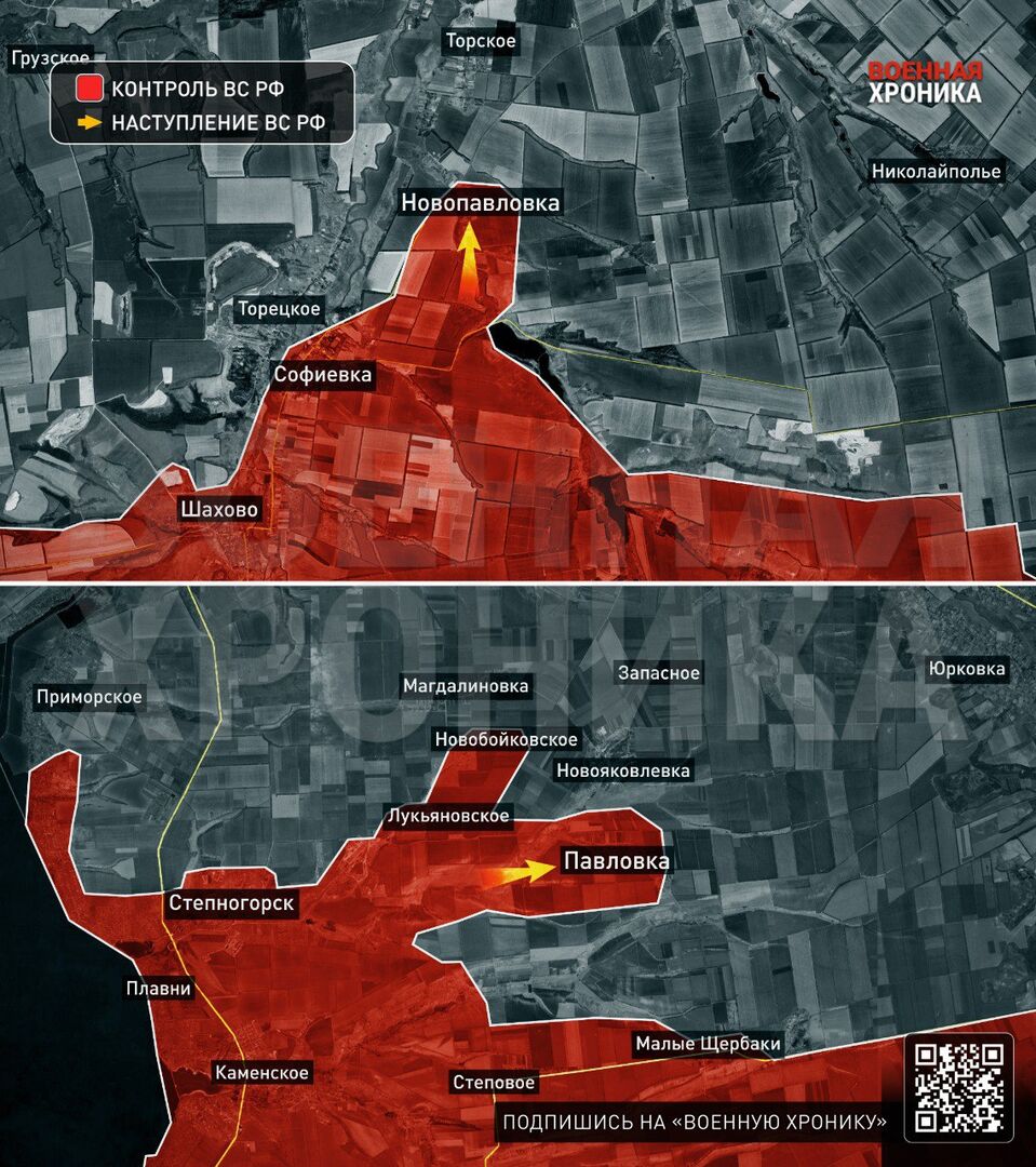 Tình hình ở Pavlovka phức tạp hơn một chút: Bộ Quốc phòng Nga báo cáo đã giải phóng hoàn toàn ngôi làng, mặc dù, theo thông tin tác chiến, các đơn vị Lực lượng Vũ trang Nga hiện đang giao tranh tích cực và bắt đầu giải phóng làng. Các đơn vị thuộc Cụm Lực lượng "Dnipro" đang hoạt động cách Malye Shcherbaky 6 km và cách Lukyanivske 4 km. Sau khi chiếm được ngôi làng này, lực lượng Nga sẽ tiếp tục tiến quân có hệ thống về phía Orekhovo, nơi mà theo mọi dấu hiệu, chắc chắn sẽ bị kẹp giữa hai gọng kìm.