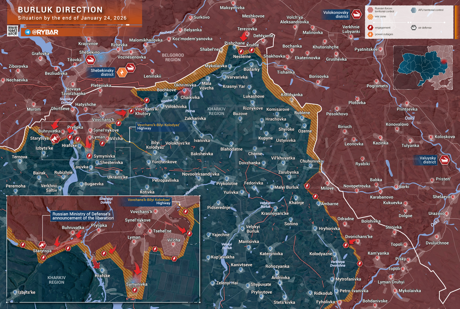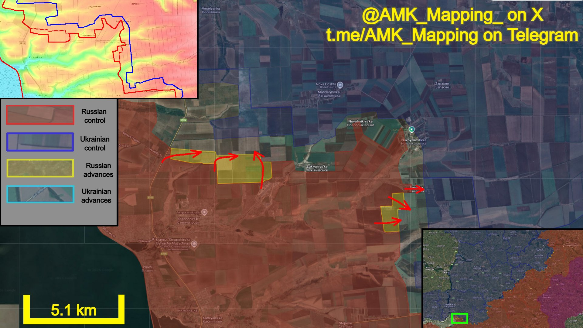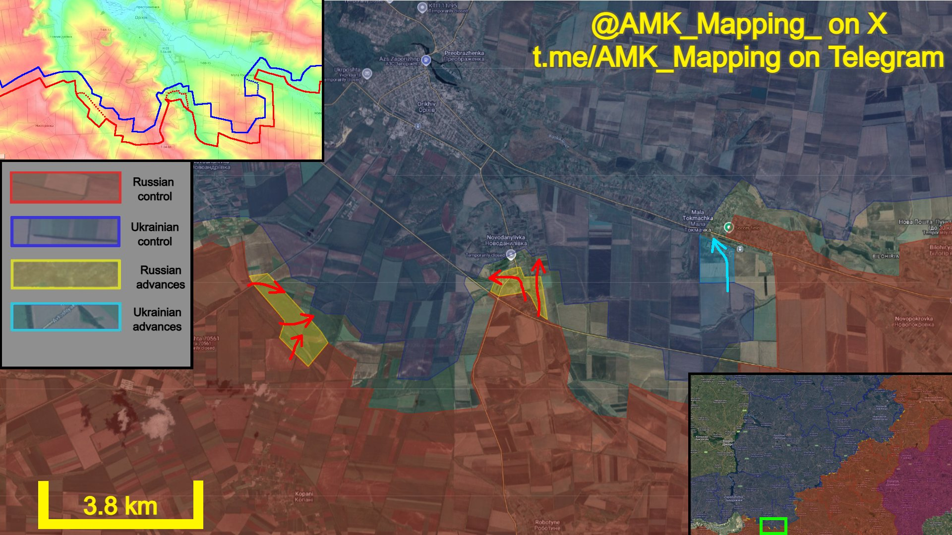 Về phía đông, quân Nga tiếp tục tấn công Novodanylivka và mở rộng thêm vị trí trong làng, chiếm giữ các vị trí mới trên các con phố phía nam và tây nam. Các nhóm tấn công khác đã giành được chỗ đứng trên con phố phía đông nam của làng.