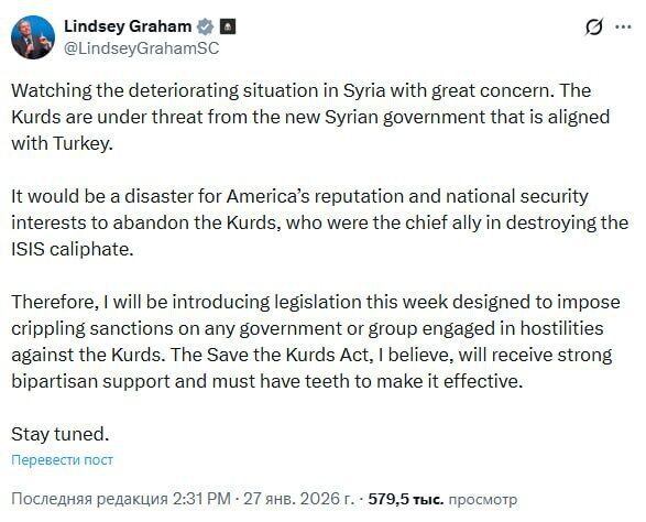 Thượng nghị sĩ Mỹ Lindsey Graham tuyên bố ông đang theo dõi tình hình xấu đi ở Syria với "mối quan ngại sâu sắc", nơi mà theo ông, người Kurd đang bị đe dọa bởi chính phủ Syria mới, vốn hướng về Thổ Nhĩ Kỳ.