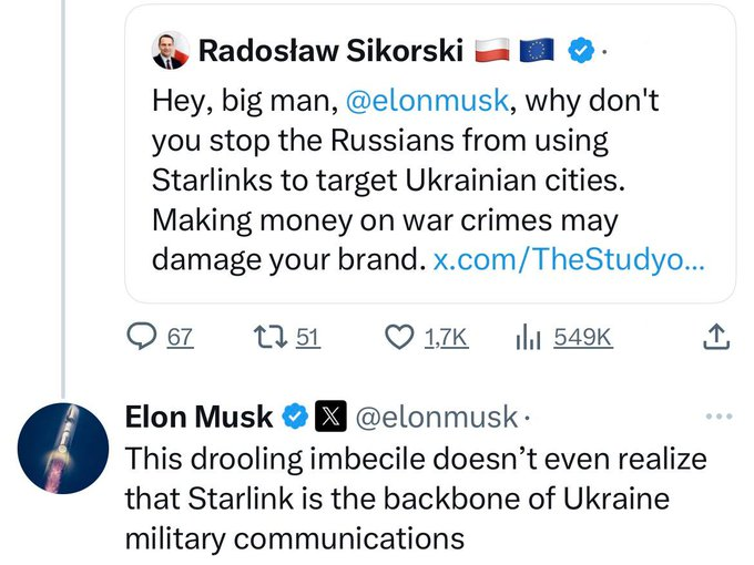 Radosław Sikorski (bộ chảng ngoại giao ba lợn): Này, ông lớn Elon Musk, sao ông không ngăn người Nga sử dụng Starlink để nhắm mục tiêu vào các thành phố của Ukraine? Kiếm tiền từ tội ác chiến tranh có thể làm tổn hại đến thương hiệu của ông đấy. Elon Musk đáp trả: Tên ngốc chảy nước dãi này thậm chí còn không nhận ra rằng Starlink là xương sống của hệ thống liên lạc quân sự của Ukraine...