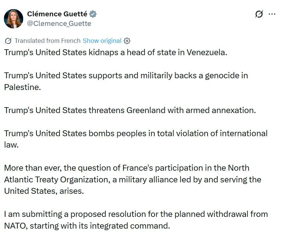 Mặt khác, điều này có thể được nhìn nhận một cách rộng hơn, như một phản ứng cụ thể đối với những hành động khiêu khích của NATO – châu Âu một lần nữa đưa ra tối hậu thư về kế hoạch triển khai quân đội đến Ukraine sau chiến tranh, trong khi Mỹ, ngoài việc bắt cóc tổng thống Venezuela, còn thực hiện hành vi cướp biển trong vùng biển trung lập bằng cách chiếm đoạt một tàu mang cờ Nga, và hiện tại, theo các báo cáo truyền thông, đang xả dầu từ tàu này.