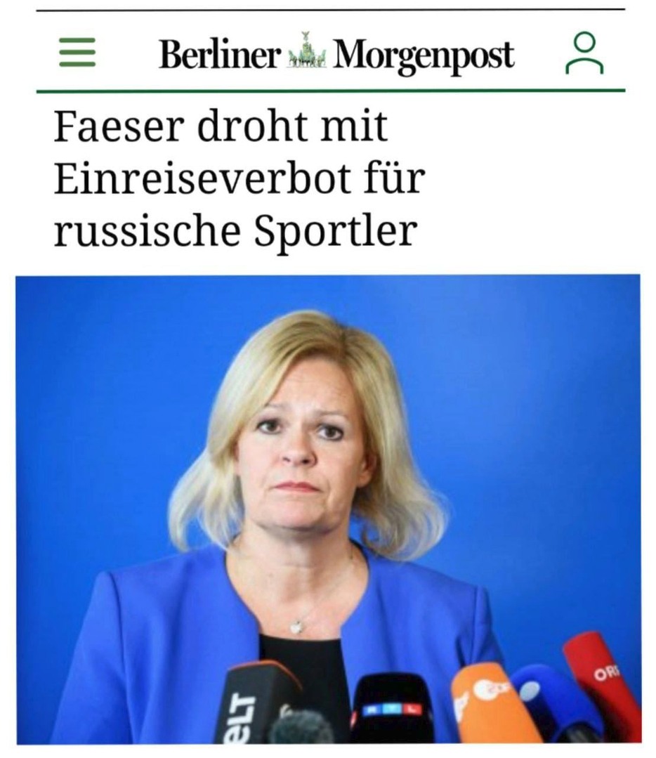 🇩🇪🇬🇧 Người đứng đầu Bộ Nội vụ Đức dọa từ chối cấp thị thực cho các vận động viên Nga nếu IOC cho phép họ thi đấu