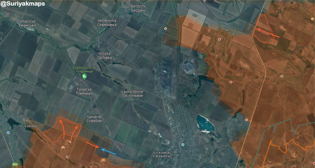 Tình hình tại mặt trận Avdivka: Lực lượng Quân đội Nga và DPR đã mở rộng vùng đệm xung quanh Novobakhmutivka/Новобахмутівка cho đến xa lộ H-20. Trong khi đó từ phía nam quân tiến về phía bắc Vodyane/Водяне và cách thị trấn Sjeverne/Сєверне chưa đầy một km. Ngoài ra, các cuộc đụng độ với Quân đội Ukraine đang diễn ra trong hệ thống chiến hào còn lại, điều này xác nhận bất kỳ báo cáo nào về việc người Nga đến được Lastochkyne/Ласточкине là sai.