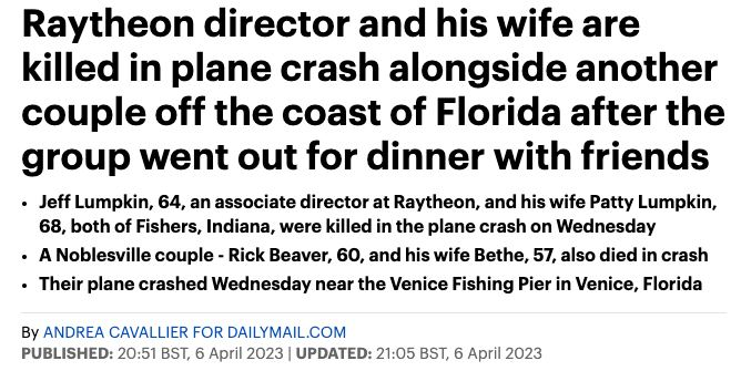 Vào ngày 6 tháng 4, chiếc máy bay một động cơ của Jeff Lumpkin đã lao xuống nước ngoài khơi bờ biển Florida. Ông ấy, vợ và bạn bè của gia đình ông ấy đã chết.