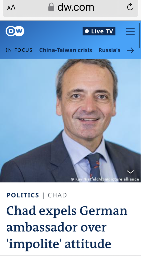 Jan-Christian Gordon Kricke, người đã giữ chức vụ đại sứ Đức tại Chad từ năm 2021, được cho 48 giờ để rời khỏi quốc gia Trung Phi này vào thứ Sáu.