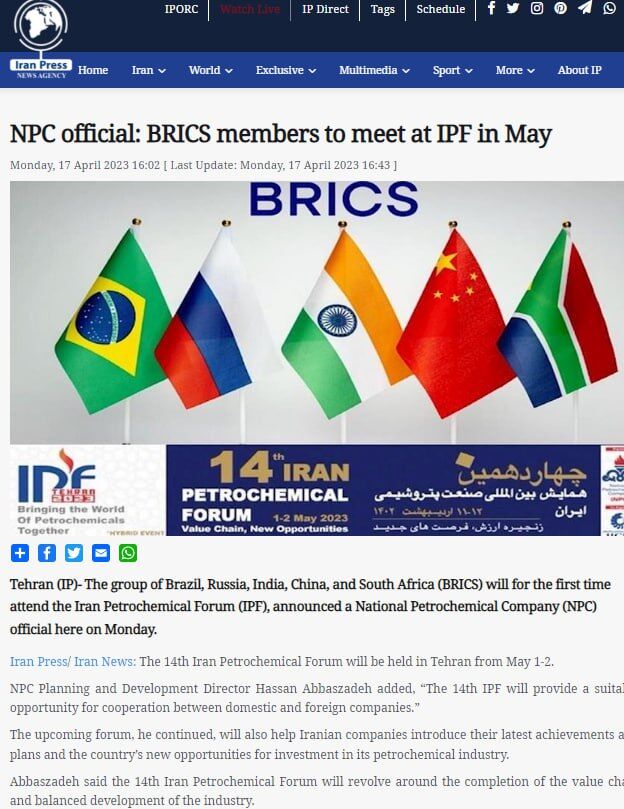 Một nhóm các nước Brazil, Nga, Ấn Độ, Trung Quốc và Nam Phi (BRICS) sẽ lần đầu tiên tham dự Diễn đàn Hóa dầu Iran, người phát ngôn của Công ty Hóa dầu Quốc gia thông báo hôm nay.