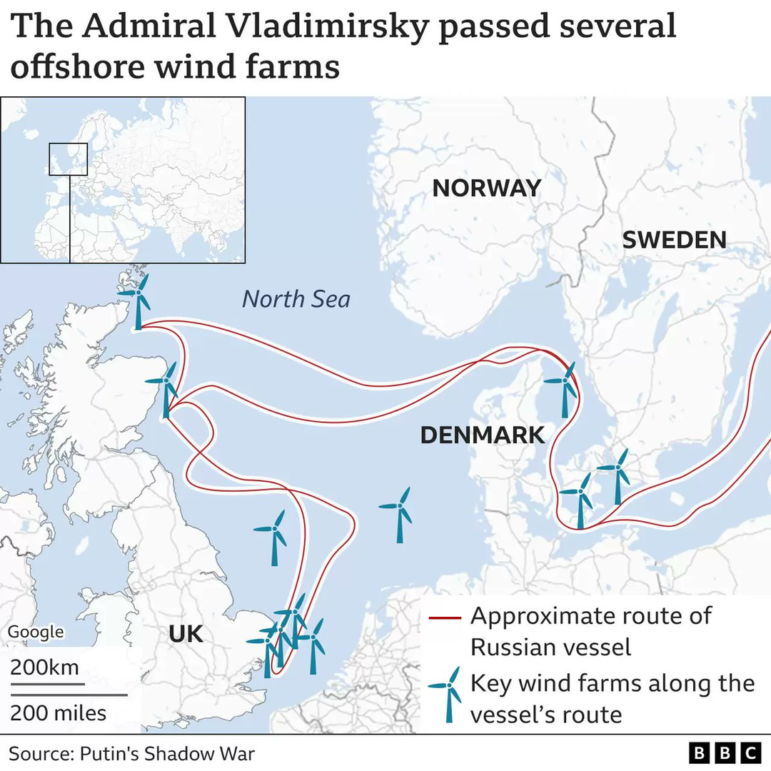 Con tàu đã được nhìn thấy ở các khu vực gần với 7 trang trại gió ngoài khơi Vương quốc Anh và Hà Lan.