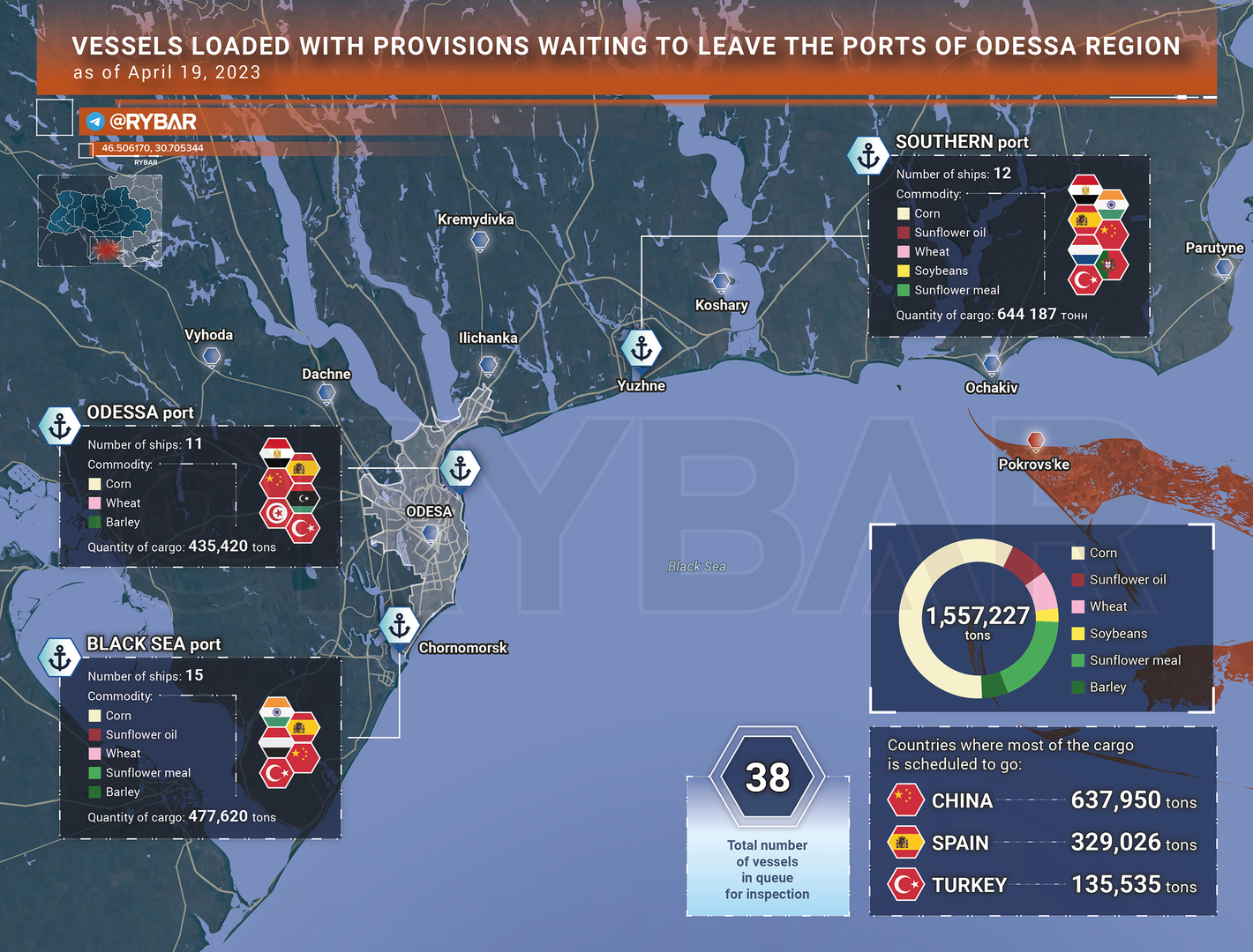 Tại các cảng của vùng Odessa, tình hình cũng tương tự: hiện có 38 tàu đang chờ kiểm tra. Không cần phải nói, hầu hết tất cả chúng đều được gửi đến Trung Quốc, các nước EU và Thổ Nhĩ Kỳ, chứ không phải các quốc gia châu Phi?