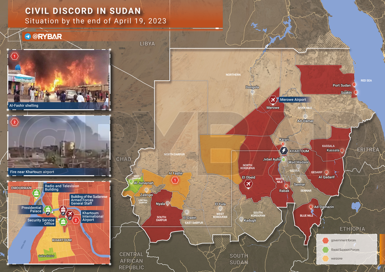 Lực lượng Vũ trang Sudan đã có thể giành lại quyền kiểm soát tòa nhà Bộ Tổng tham mưu và sân bay của thủ đô. Trong quá trình chiến đấu, các kho nhiên liệu đã bị hư hại, dẫn đến những đám cháy lớn bắt đầu, hiện vẫn đang hoành hành.