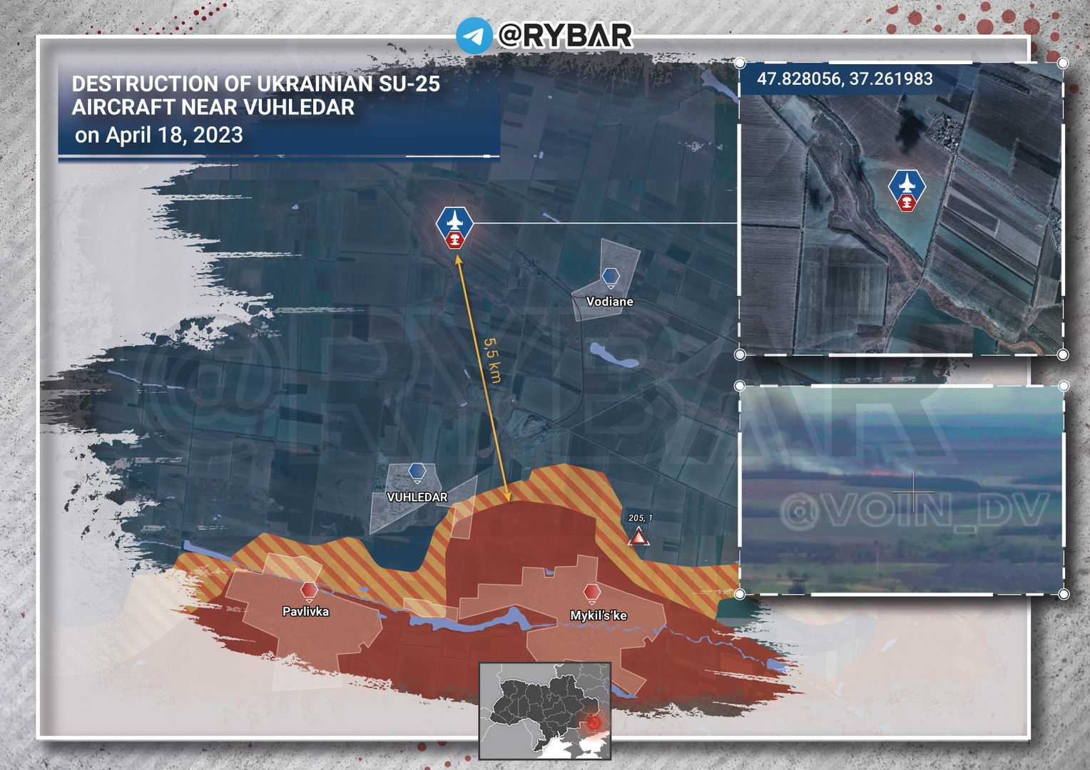 Vào chiều ngày 19 tháng 4, @rt_russian đã công bố một đoạn video về công việc của một xạ thủ MANPADS từ lữ đoàn thủy quân lục chiến độc lập thứ 155 ở vùng lân cận Vugledar. Đoạn ghi âm cho thấy vụ phóng tên lửa phòng không, sau đó mục tiêu bị trúng đạn rơi xuống phía tây bắc làng Vodiane.