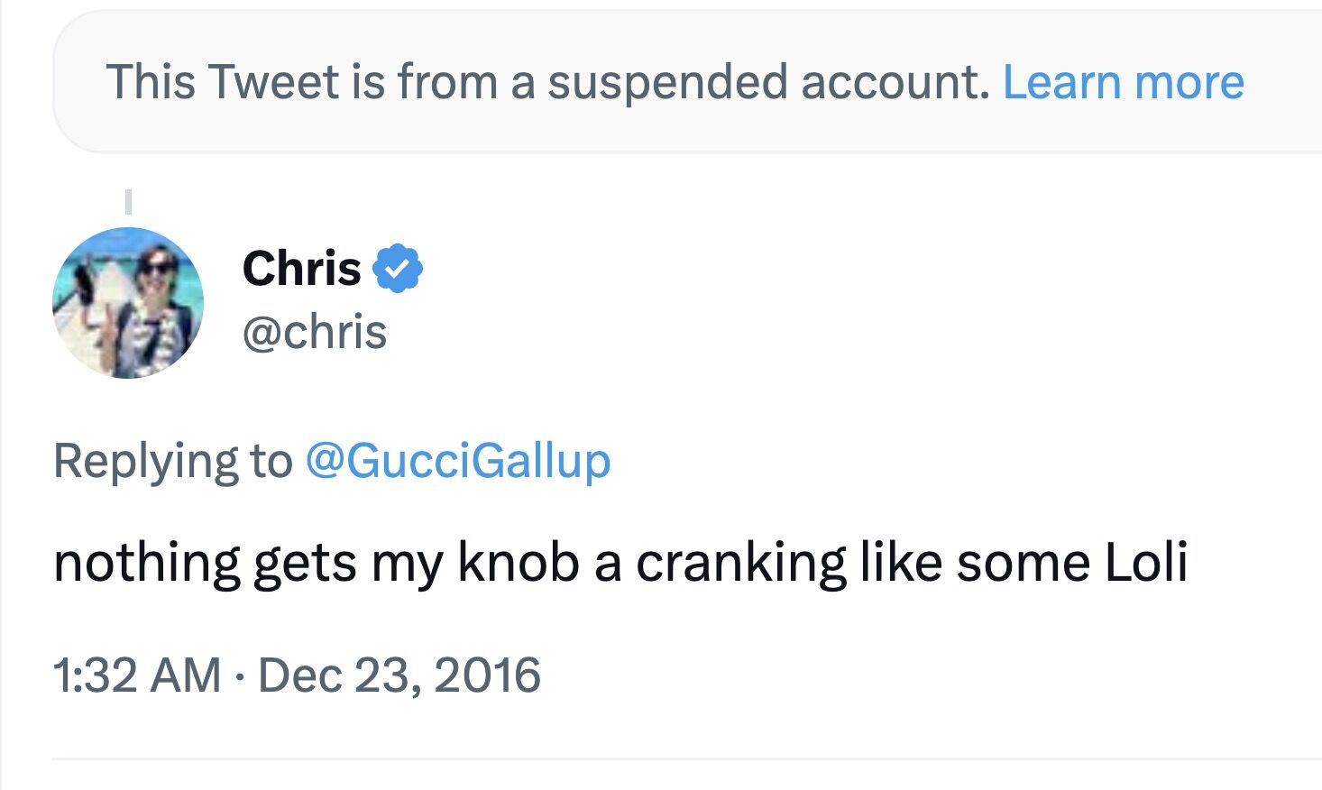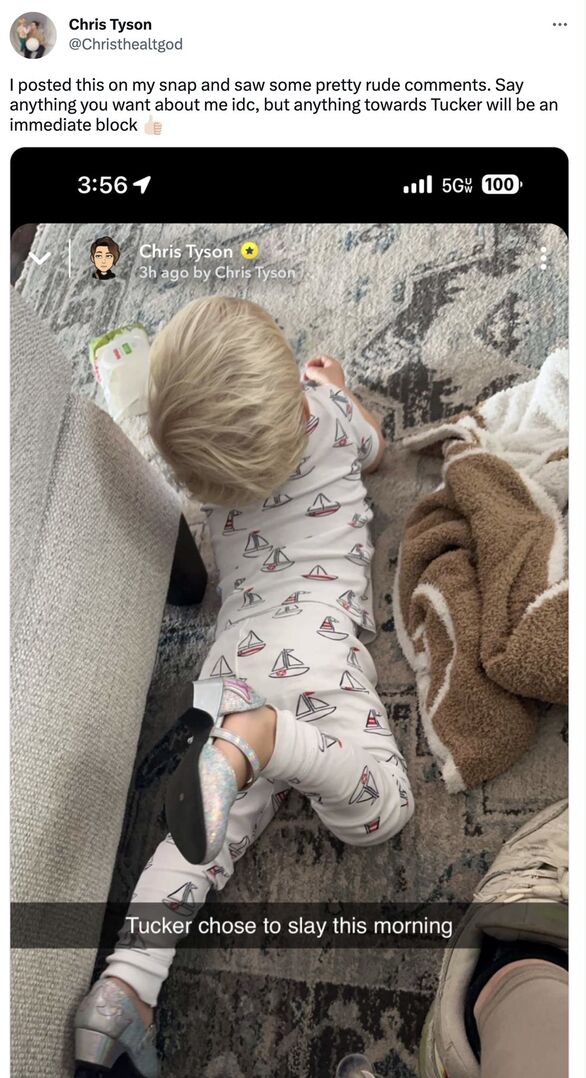 Ngôi sao YouTube dành cho trẻ em nổi tiếng Chris Tyson, người gần đây đã tuyên bố chuyển sang giới tính nữ, đã khóa tài khoản Twitter của họ sau tiết lộ về những dòng tweet đáng lo ngại. Chris đã đăng bài về việc bị kích thích tình dục bởi lolicon, một thể loại phim hoạt hình tình dục có các cô gái trẻ/trẻ mới biết đi. Vào tháng 11, Chris đã đăng một bức ảnh cậu con trai mới biết đi của anh ấy đi giày cao gót. Chris cũng đã đăng về việc lên đỉnh trong quan hệ tình dục khi gọi hồn Hitler.