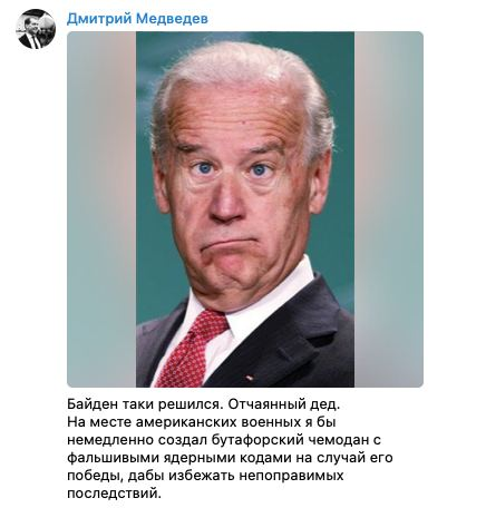 "ông nội tuyệt vọng" là danh xưng Medvedev gọi Biden, người đã chính thức tuyên bố ý định tham gia tranh cử tổng thống Mỹ năm 2024.