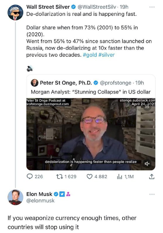 Doanh nhân này đã bình luận trên Twitter về tin tức về việc phi đô la hóa đang tăng tốc gấp 10 lần và giảm tỷ trọng của nó trong nền kinh tế từ 55% xuống 47%.