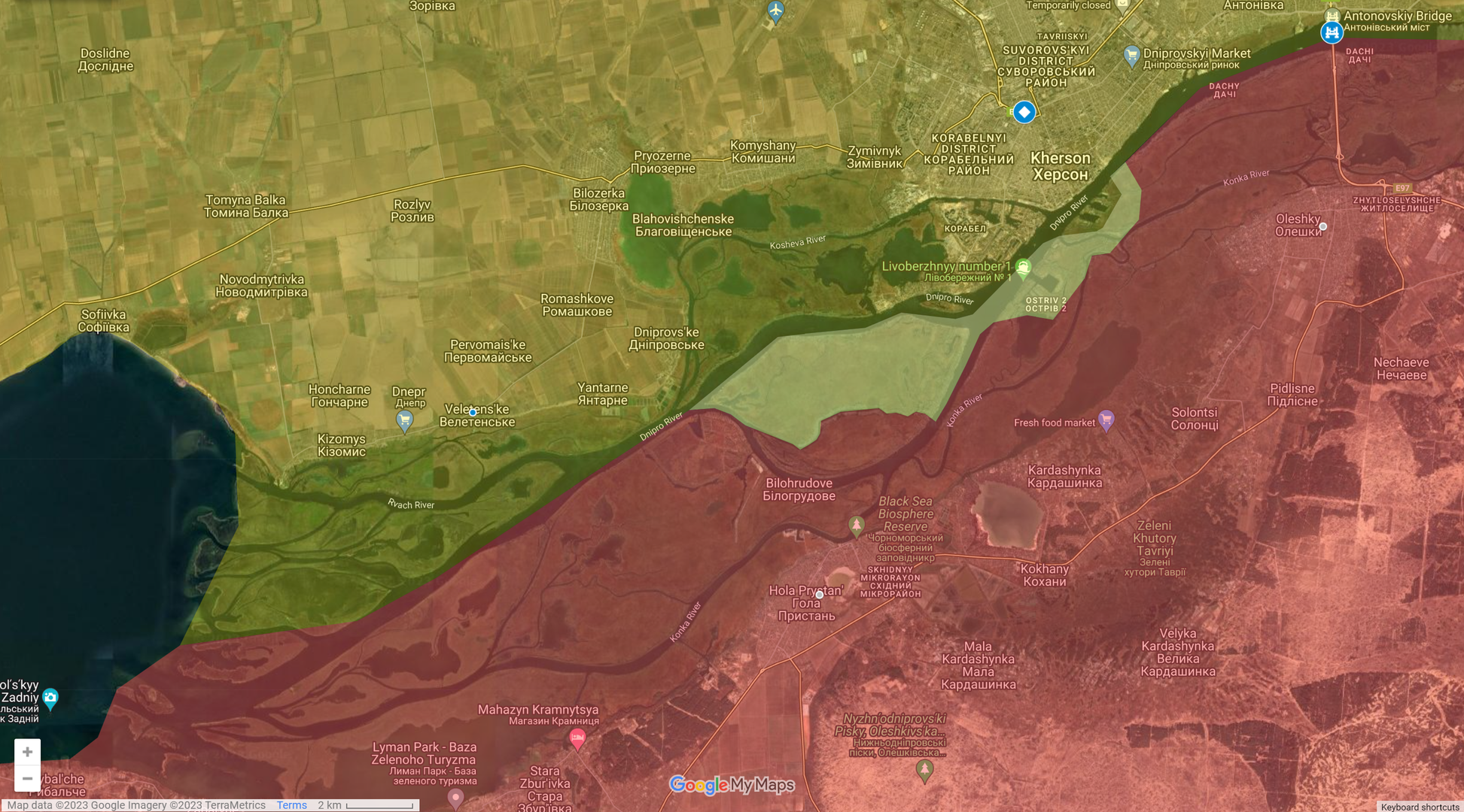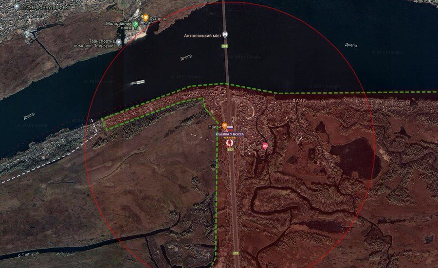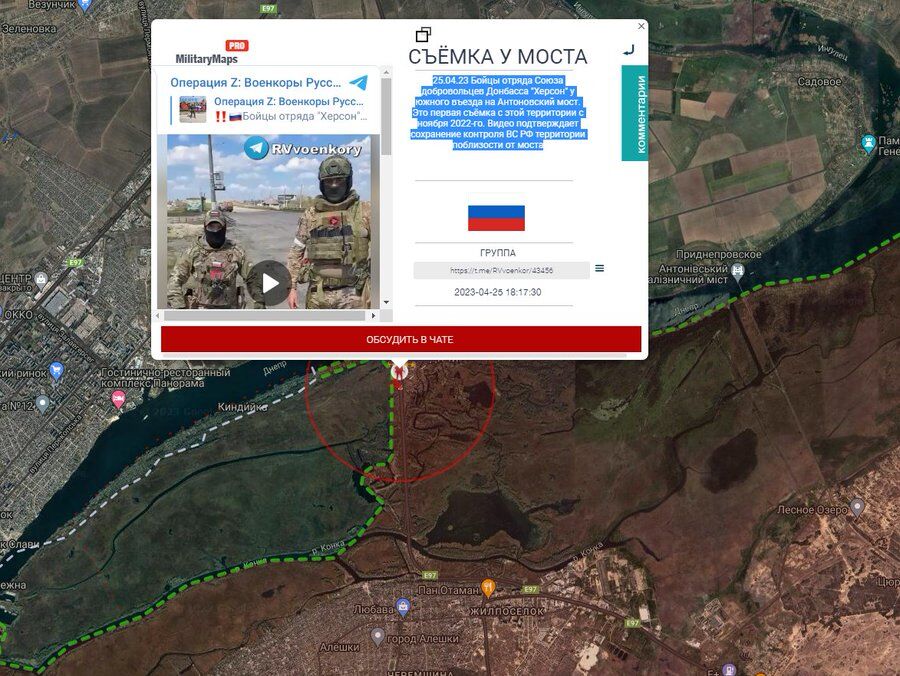 Binh lính Nga đi dao ở đầu phía nam của cầu Antonovsky. Nơi các kênh truyền thông PT mấy ngày hôm nay ra rả về một đầu cần tấn công đã được lập.