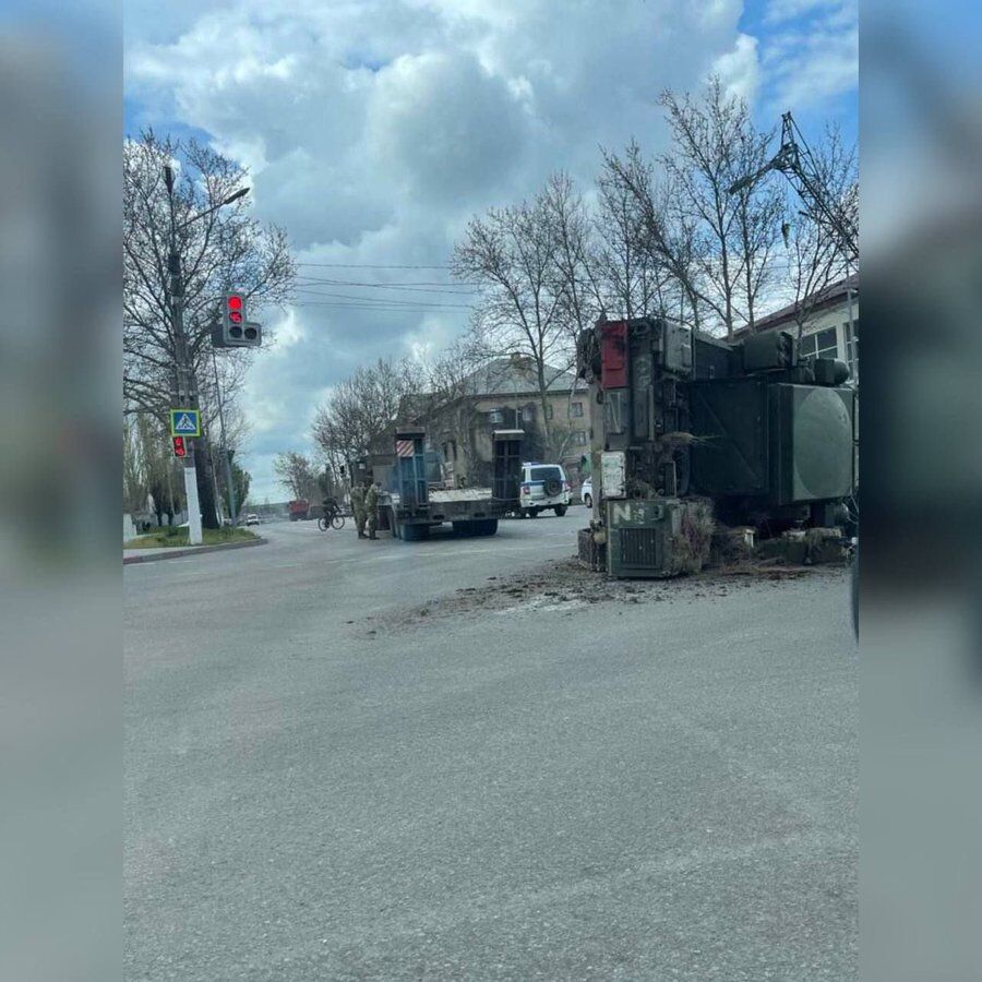 Tiếp tục một xe phòng không của Nga đã bị lật trên đường dọc theo Đại lộ Bohdan Khmelnytskyi - ngay trung tâm của Melitopol.
