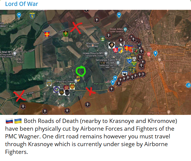 📌🇷🇺🇺🇦 Cả hai Con đường Tử thần (gần Krasnoye và Khromove) đã bị Lực lượng Dù và PMC Wagner cắt đứt. Tuy nhiên, vẫn còn một con đường đất, bạn phải đi qua Krasnoye, nơi hiện đang bị bao vây bởi quân dù.