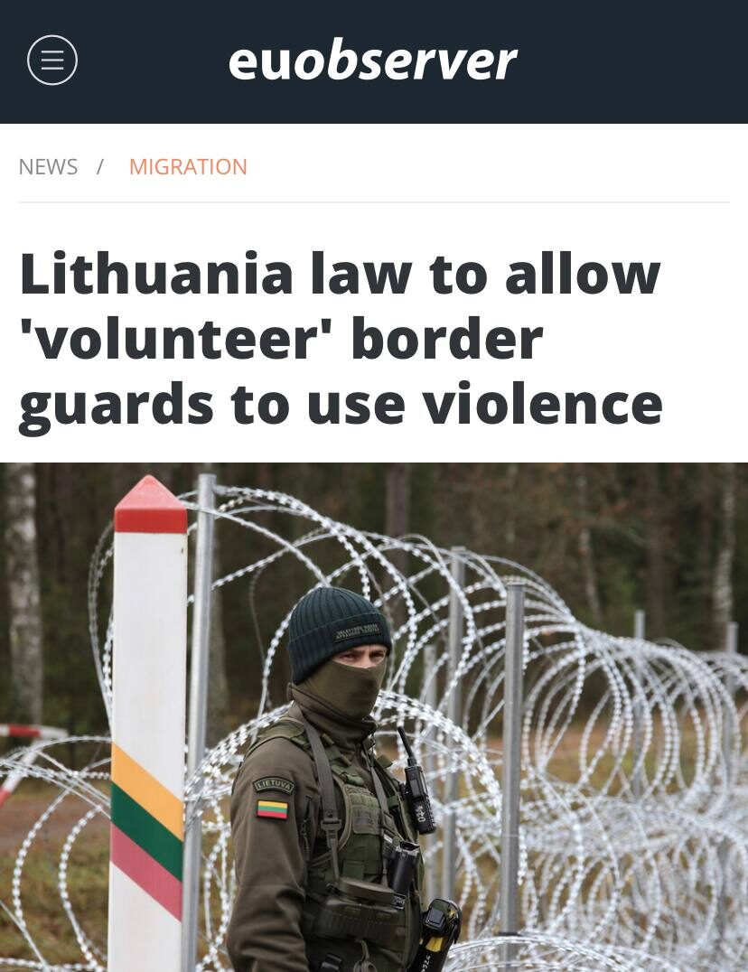 Litva : Seimas đã thông qua luật mới cho phép các tình nguyện viên từ khắp châu Âu tham gia lực lượng bảo vệ biên giới quốc gia và trao cho họ quyền sử dụng bạo lực đối với người di cư đến từ Belarus!,,