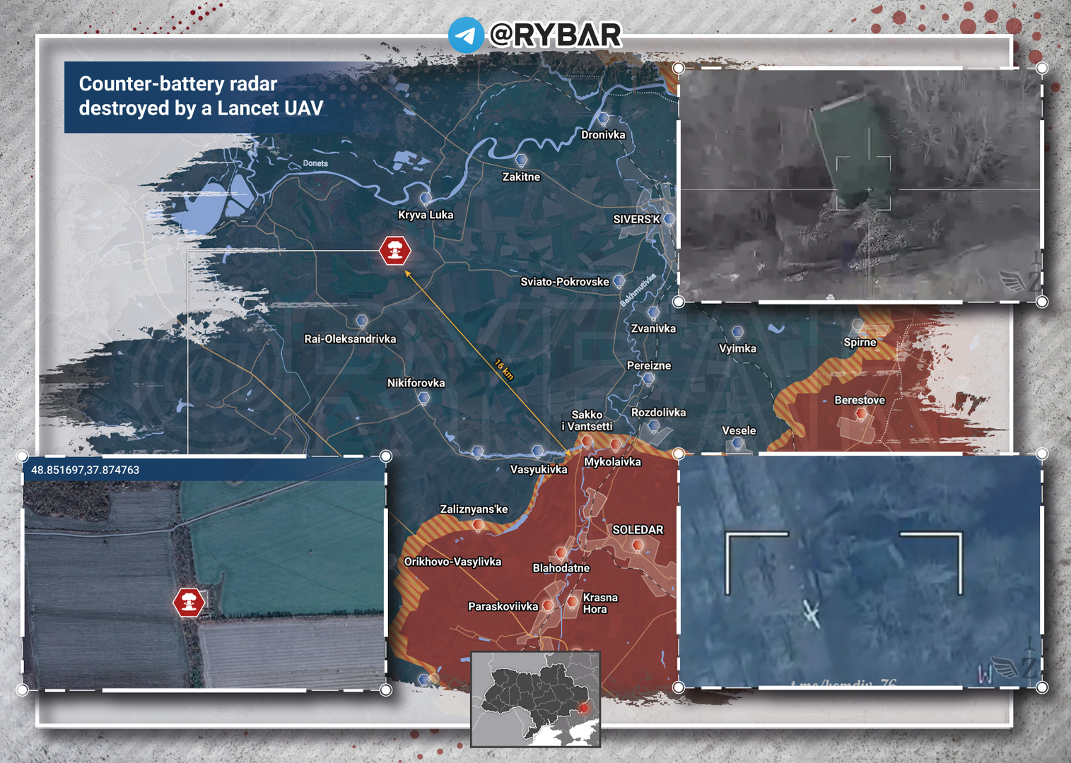 Vào giữa tuần, một đoạn phim về việc hạ gục một mục tiêu hiếm hoi đã xuất hiện - một radar phản pháo AN / TPQ-37 do Mỹ sản xuất. Phương tiện bị các binh sĩ của Sư đoàn tấn công đường không cận vệ 76 bằng loại đạn tuần kích Lancet.