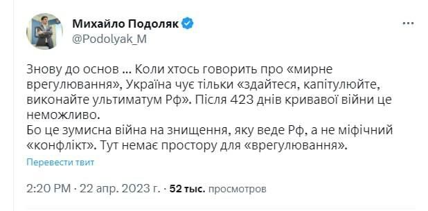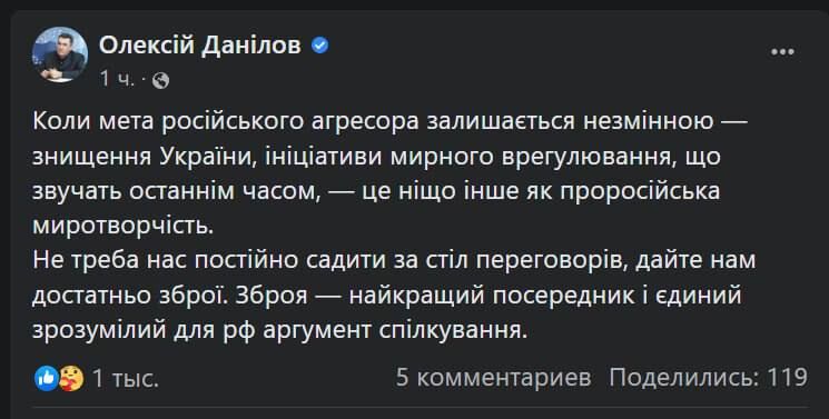 ▪️"Chúng tôi không cần phải liên tục đặt chúng tôi vào bàn đàm phán, hãy cung cấp cho chúng tôi đủ vũ khí. Vũ khí là trung gian hòa giải tốt nhất và là lý lẽ giao tiếp duy nhất có thể hiểu được đối với Liên bang Nga", Oleksiy Danilov, Thư ký Hội đồng Quốc phòng và An ninh Quốc gia của Ukraine, đã viết. ▪️Mikhail Podolyak, cố vấn của chánh văn phòng Tổng thống Ukraine, cũng chỉ trích các sáng kiến hòa bình. Podolyak viết: “Khi ai đó nói về một giải pháp hòa bình, Ukraine chỉ nghe thấy một điều - “đầu hàng, đầu hàng, tuân thủ tối hậu thư của Liên bang Nga”.