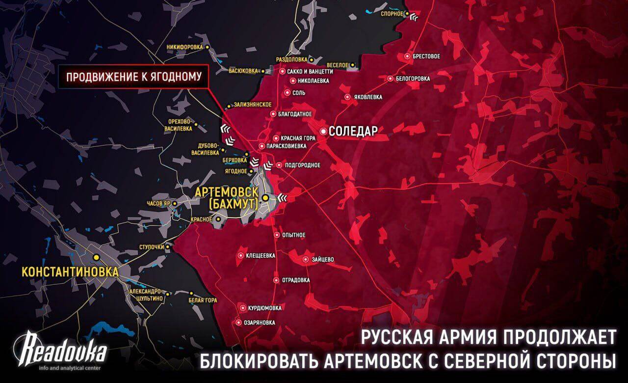 Tin tức đến từ vùng ngoại ô phía bắc của Artemovsk (Bakhmut). Sau khi giải phóng Paraskovievka, các đội tấn công của PMC "Wagner" đã đi trên một sườn núi rộng phía sau đường cao tốc Artemovsk-Slavyansk theo hướng tây. Hiện tại, người ta biết rằng họ đã đến gần Berkhovka, từ đó một con đường nông thôn tiến về hậu phương Ukraine, đến Yagodnoye và cũng đi xa hơn về phía bắc, đến Dubovo-Vasilyevka. Có thông tin về việc chiếm giữ một độ cao thuận tiện trong khu vực, tạo điều kiện cho các hoạt động tấn công.