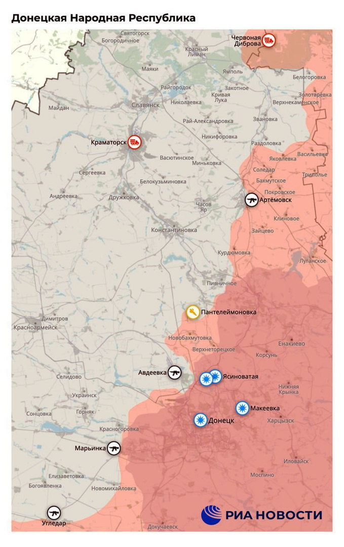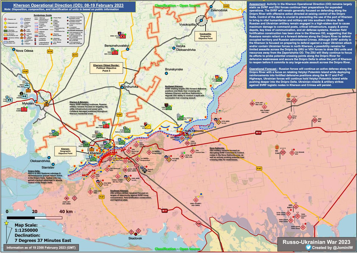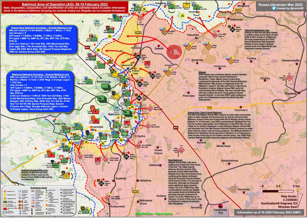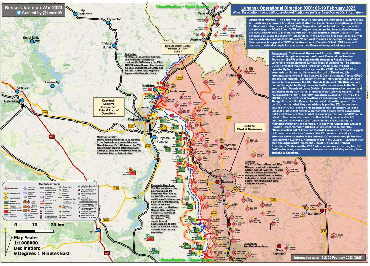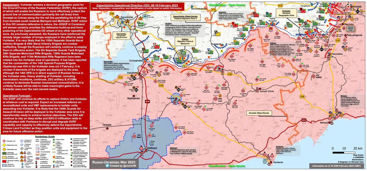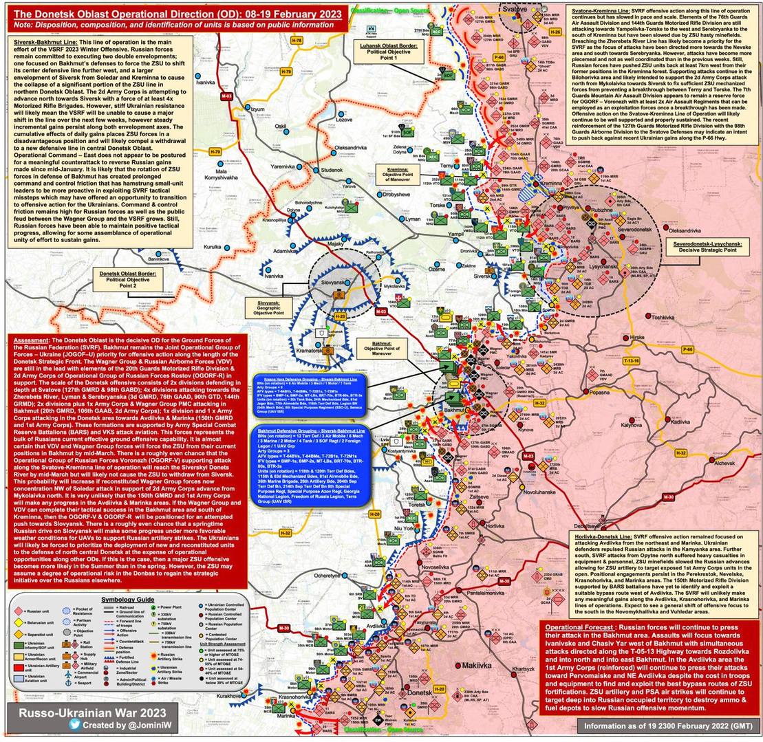 Donetsk OD. Donetsk Oblast vẫn là OD quyết định cho Lực lượng mặt đất Nga. Nếu các đơn vị của Tập đoàn Dù & Wagner Nga có thể hoàn thành bước tiến ổn định của họ ở Bakhmut trong những tuần tới, thì khả năng xảy ra một cuộc tấn công được hỗ trợ của Quân đoàn 2 vào Siversk sẽ tăng lên.