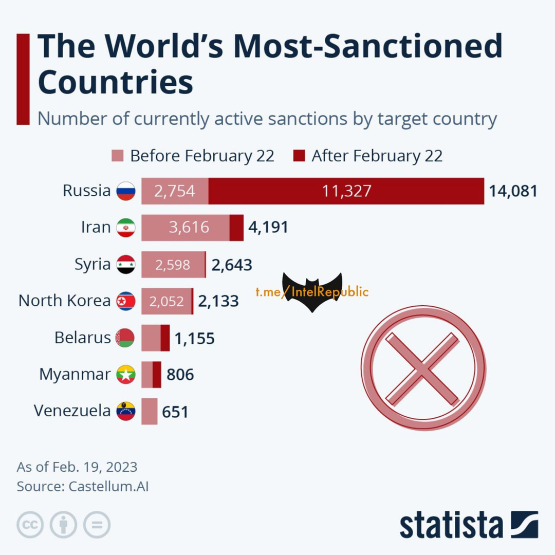 Các nước bị cấm vận nhiều nhất bởi phương Tây. Với Nga, đó là con số kinh khủng: hơn 14 ngàn, trong khi, các vật tư thiết yếu như nhiên liệu hạt nhân, phân bón, kim loại màu, v.v.. vẫn chảy từ Nga sang họ.