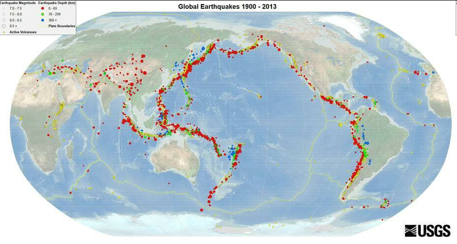 Các khu vực trên thế giới xảy ra động đất vào năm 1900-2013 Có thể thấy rằng hầu hết lãnh thổ của Nga không bị ảnh hưởng bởi chúng.