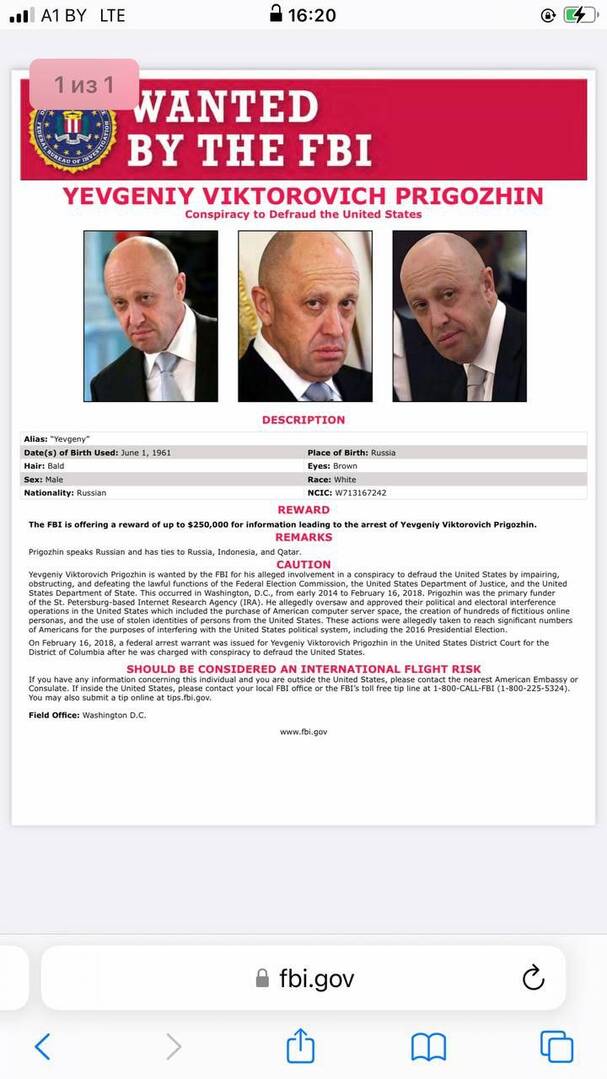 🏴☠️ FBI treo thưởng tới 250.000 USD cho thông tin giúp bắt giữ Prigozhin
