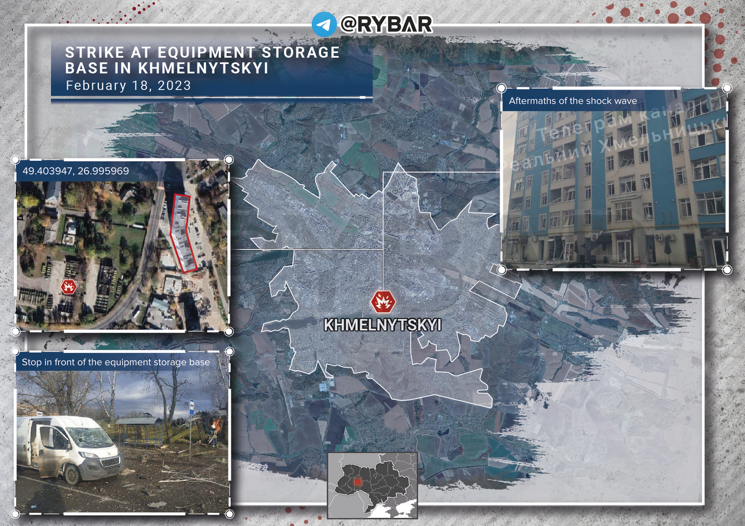 Mục tiêu bị bắn trúng là một bãi đậu xe thiết bị quân sự trên đường Kuprina 7 ( 49.403505, 26.994765 )