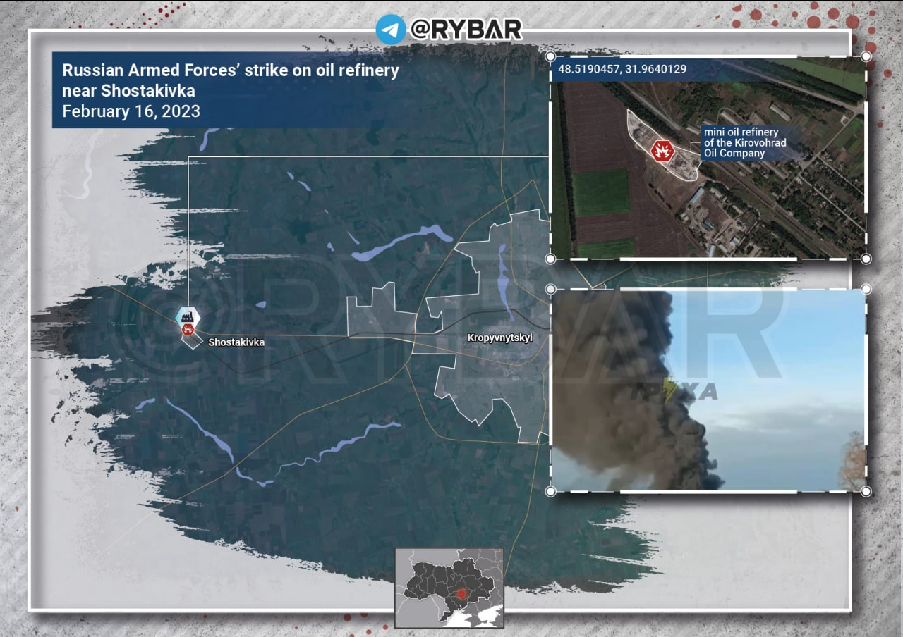 Sáng sớm ngày 16 tháng 2, Lực lượng vũ trang Nga đã tiến hành một cuộc tấn công tên lửa vào một mục tiêu ở vùng Kirovograd. Theo thông tin của chúng tôi, đối tượng của cuộc đột kích là một nhà máy lọc dầu gần làng Shestakovka, thuộc sở hữu của Công ty Dầu khí Kirovograd.