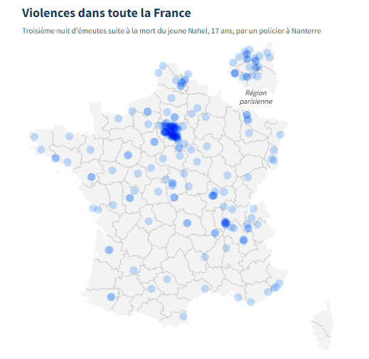 Tổng cộng 875 người đã bị bắt từ thứ Năm đến thứ Sáu tại Pháp, bao gồm 408 người ở Paris và các vùng ngoại ô của nó, trong đêm bạo lực đô thị thứ ba liên tiếp sau cái chết của Nahel, bị giết bởi một sĩ quan cảnh sát, theo một báo cáo cuối cùng .của Bộ Nội vụ.