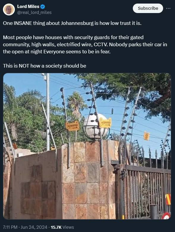 Hầu hết mọi người đều có nhà với sự an ninh của cộng đồng được kiểm soát, tường cao, dây điện và camera quan sát. Không ai đỗ xe ngoài trời vào ban đêm. Mọi người dường như đang sợ hãi.