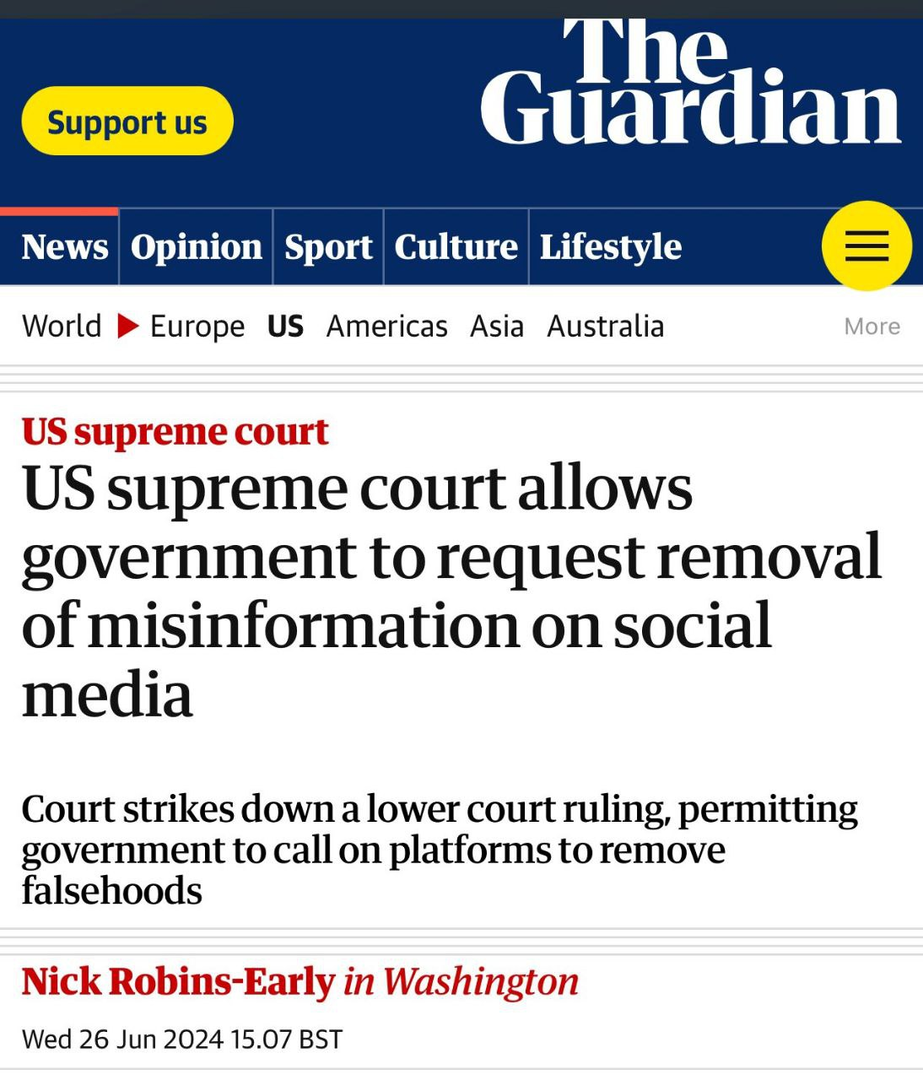 The Guardian Times: "Tòa án tối cao Hoa Kỳ chính thức cho phép chính phủ yêu cầu xóa thông tin sai lệch trên mạng xã hội." (Thực ra thì cái này cũng khá là bình thường thôi, nhưng điều đáng nói ở đây là khi những nước khác làm như vậy thì Mỹ sẽ kết tội độc tài)