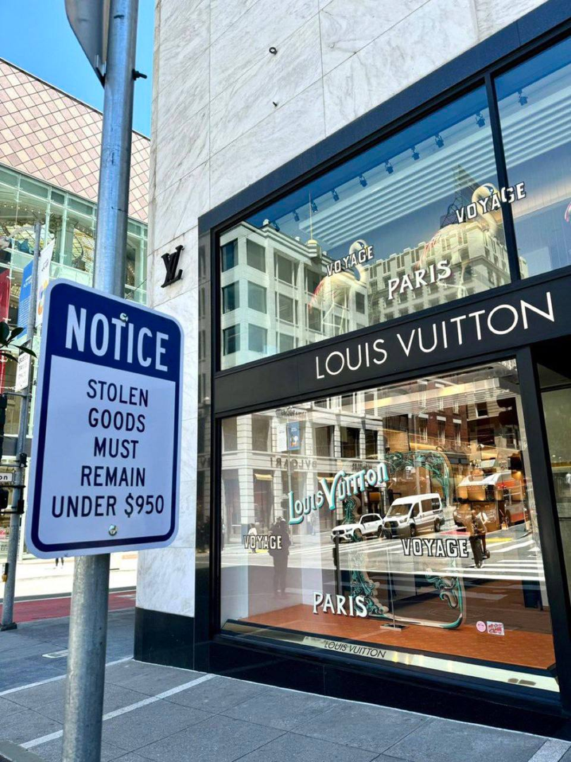 Một cảnh báo được dán bên ngoài cửa hàng Louis Vuitton ở San Francisco nhắc nhở những tên trộm rằng những món đồ chúng mang qua quầy thanh toán không được vượt quá 950 USD.