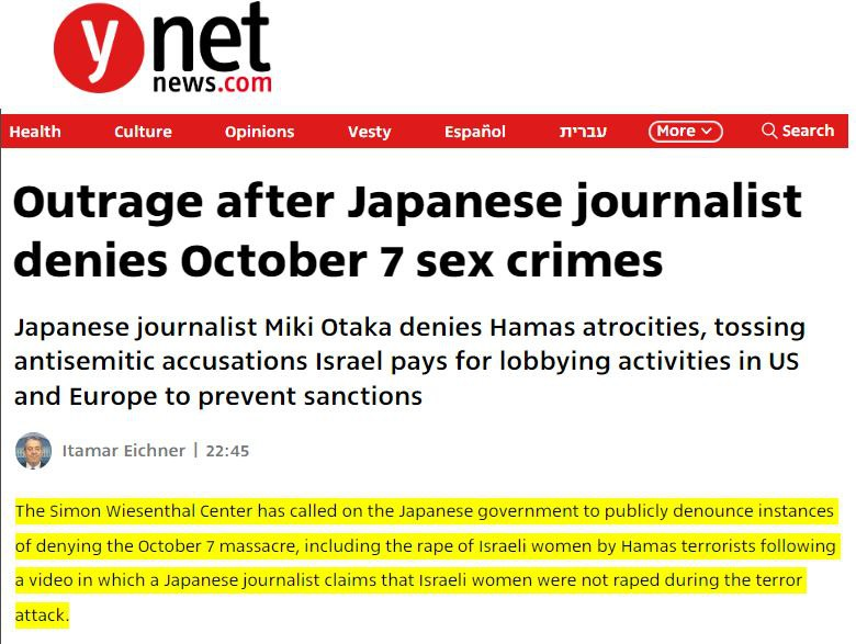 "Nhà báo Nhật Bản Miki Otaka phủ nhận vụ việc hiếp dâm và thảm sát hàng loạt của Hamas vào 7/10 và đưa ra hàng loạt cáo buộc bài do thái như hối lộ quan chức Mỹ và châu Âu để tránh các lệnh trừng phạt."