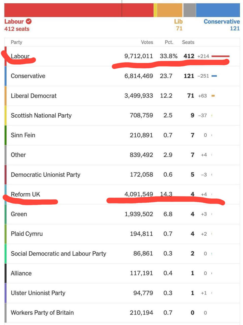 “Chế độ dân chủ” của Anh là như thế này: Đảng Lao động nhận được số phiếu bầu nhiều hơn khoảng 2,4 lần so với những người theo chủ nghĩa cải cách, nhưng họ nhận được số ghế nhiều hơn 103 lần.