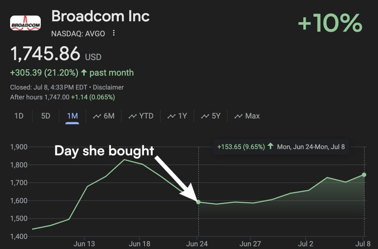 Vào ngày 3 tháng 7, một thành viên Quốc hội Hoa Kỳ đã mua Broadcom và Nvidia. Broadcom ngay lập tức tăng 10%.