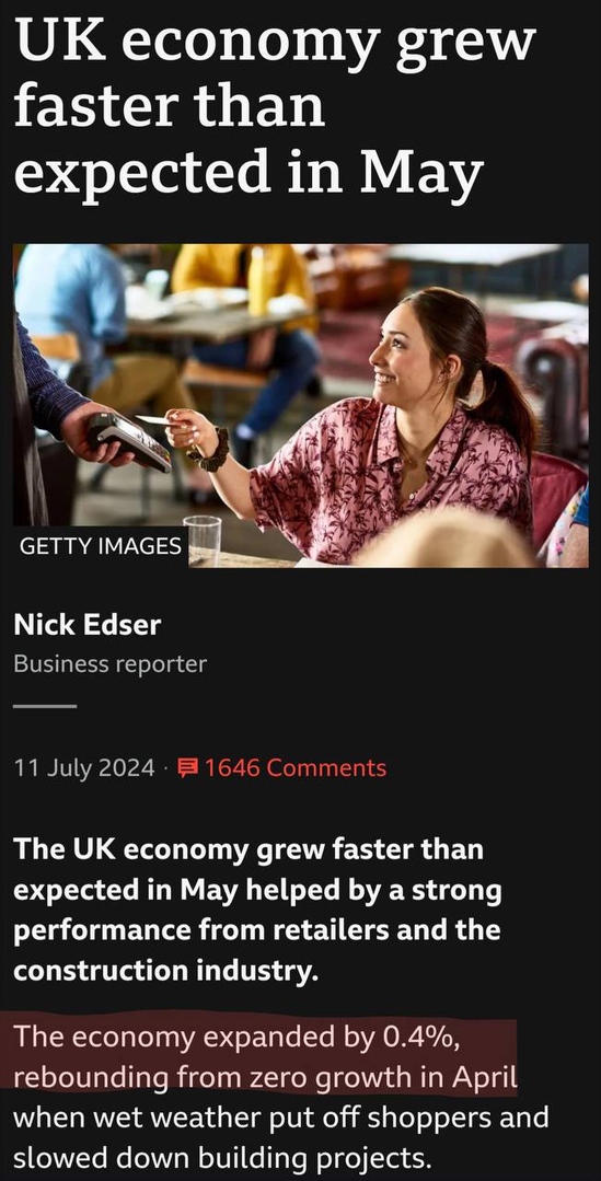 Cũng là BBC: “Nền kinh tế Anh tăng trưởng nhanh hơn dự kiến nhờ các ngành công nghiệp xây dựng và bán lẻ, lên đến con số … 0.4%”.