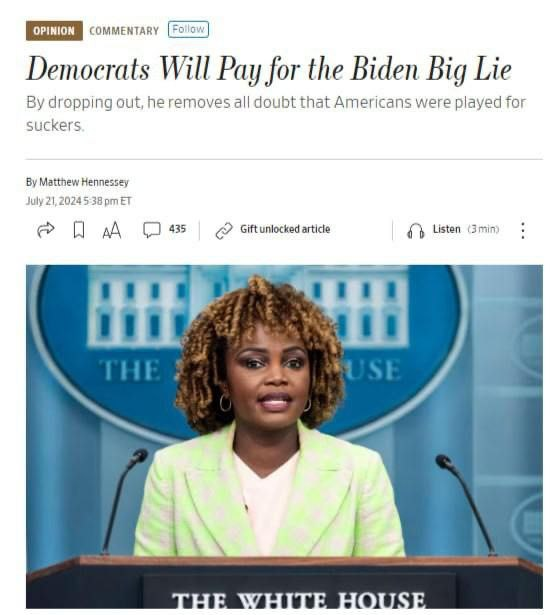 Bài báo nói rằng trong cuộc bầu cử tháng 11, “mọi người sẽ mắc phải” - từ thư ký báo chí Nhà Trắng Karine Jean-Pierre cho đến giới truyền thông đã tấn công bất cứ ai chỉ ra điểm yếu của Biden.