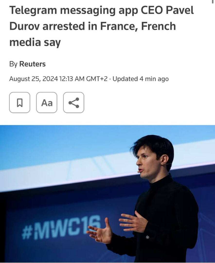 Hôm nay, #Durov đã bị bắt tại Paris vào ngày 24 tháng 8 năm 2024, khi anh ta bước xuống từ máy bay phản lực riêng của mình tại Sân bay Le Bourget. Vụ bắt giữ được tiến hành dựa trên lệnh khám xét liên quan đến các cáo buộc rửa tiền, buôn bán ma túy bất hợp pháp và phân phối nội dung liên quan đến lạm dụng trẻ em trên Telegram. Vụ bắt giữ đã làm dấy lên những lo ngại đáng kể về tương lai của anh ta và những hậu quả tiềm tàng đối với công ty của anh ta.